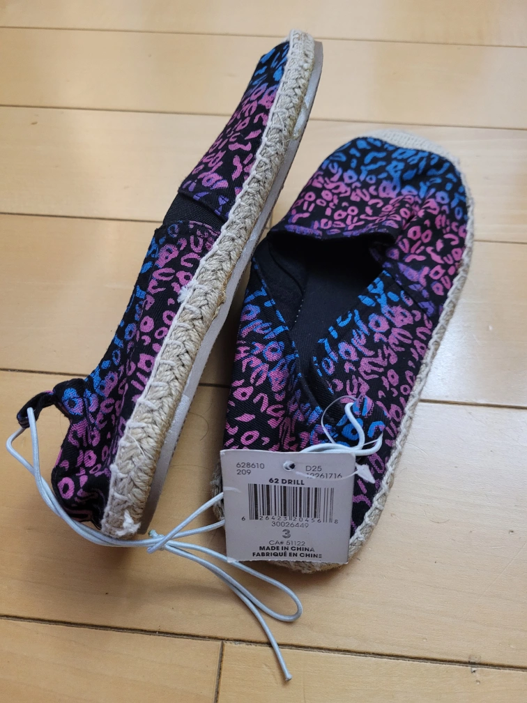 Pair of girls espadrilles. Size 3. Pink and blue abstract print on black canvas. Jute sole. New with tags.