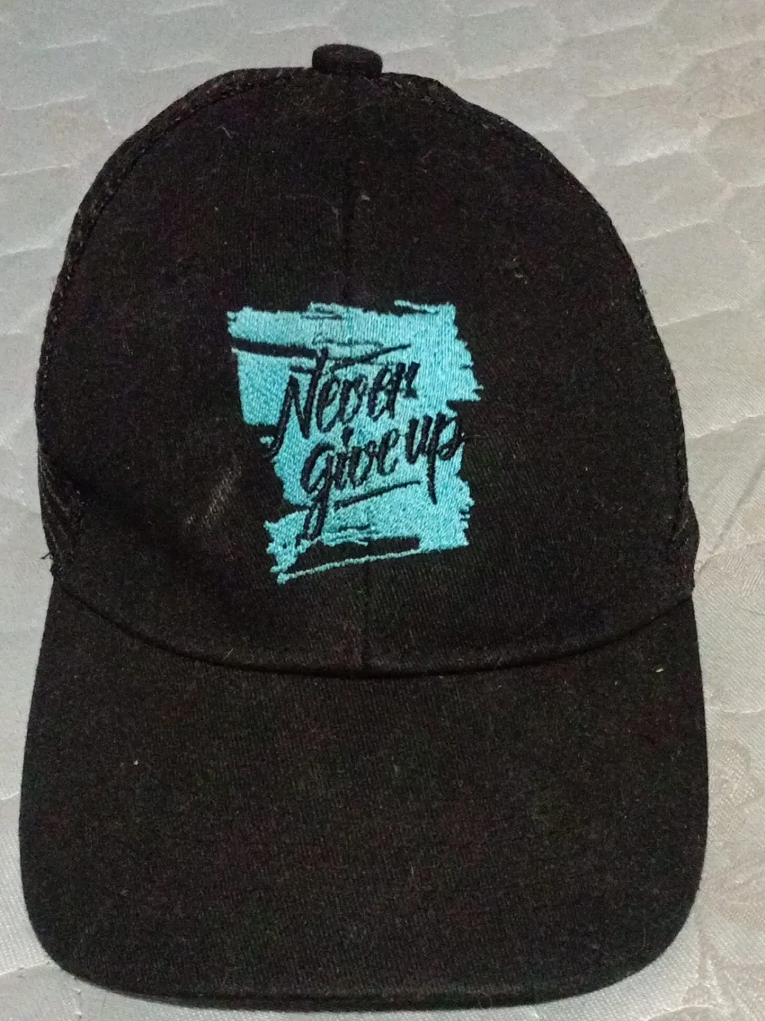This black trucker hat has a mesh back and a "Never give up" graphic on the front. It's adjustable for a comfortable fit. Mesh back design.