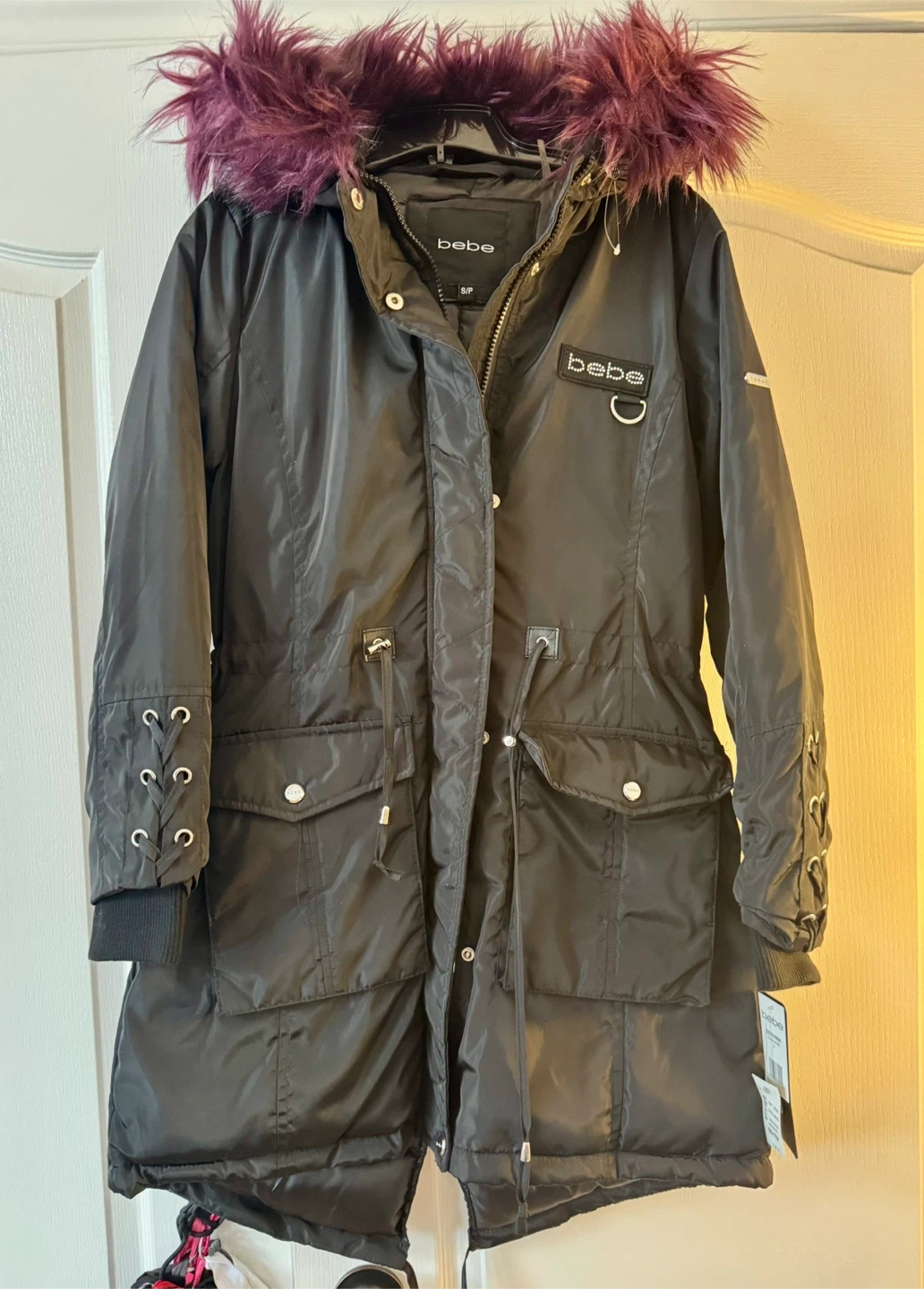 Selling a bebe black winter parka in size small. It features a stylish design with a faux fur-trimmed hood and lace-up detailing on the sleeves. Perfect for staying warm and fashionable this winter!