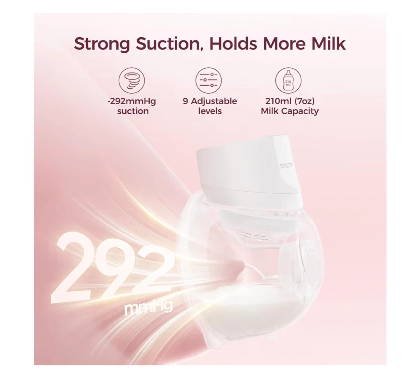 This Momcozy S12 Pro wearable breast pump offers 210ml milk capacity and 9 adjustable levels. It features -292mmHg suction power for effective milk expression. Easy to assemble and clean, it's designed for busy moms.
