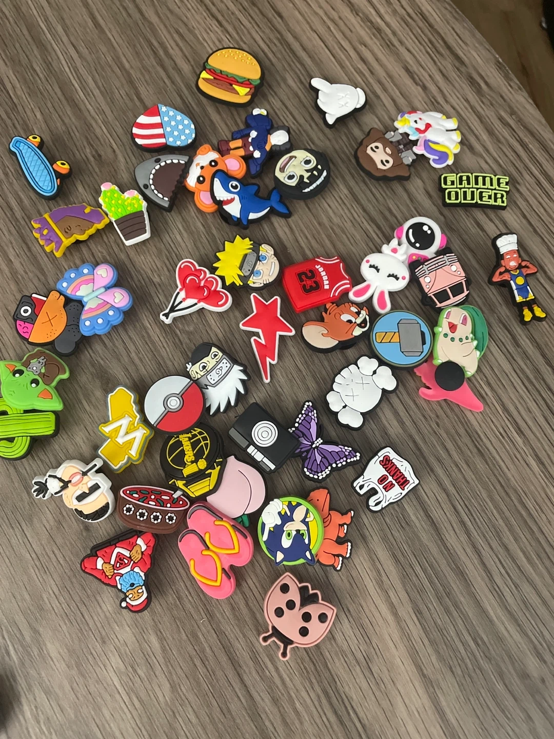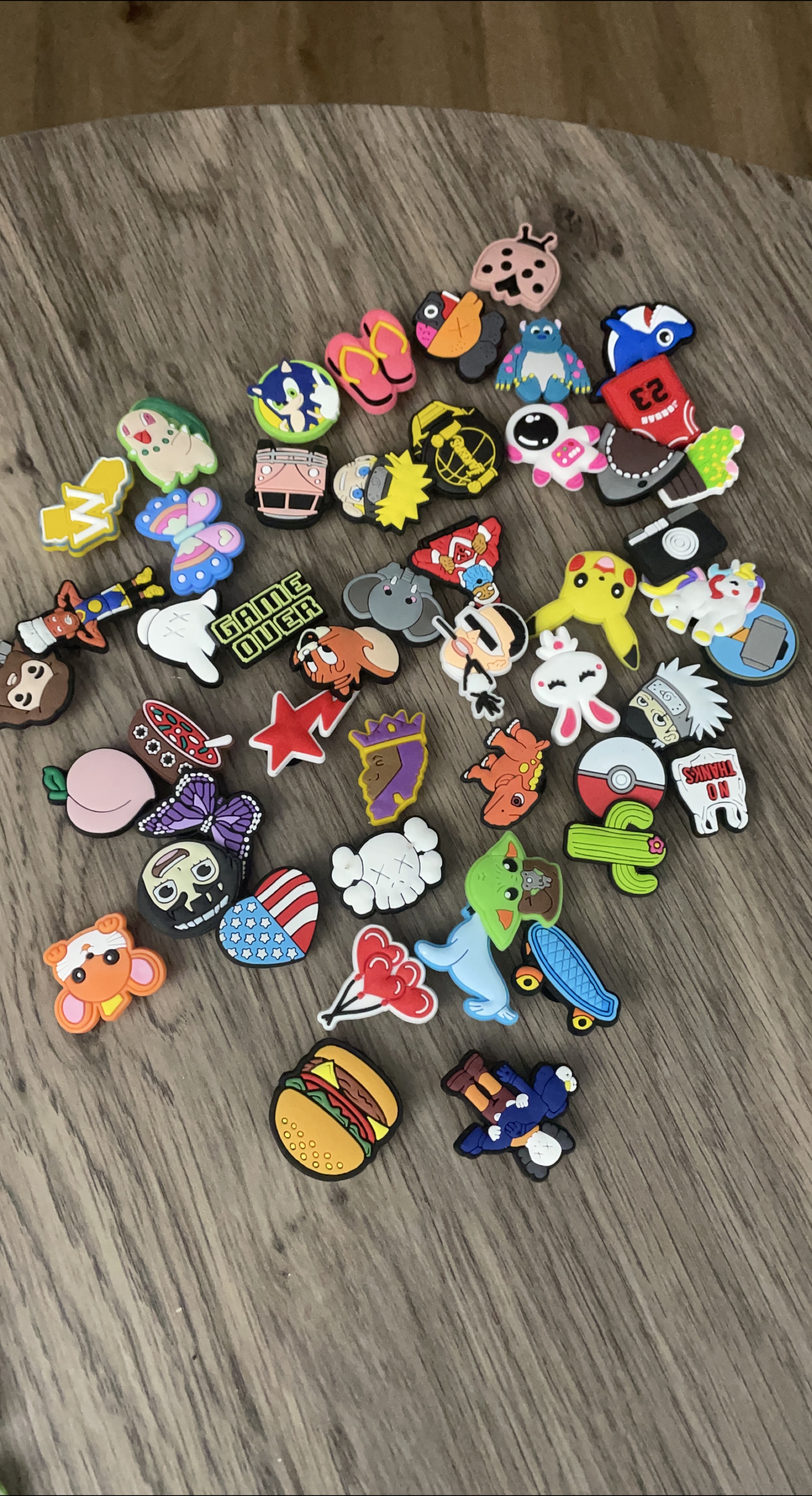 Selling a big lot of assorted Crocs Jibbitz shoe charms! Lots of fun designs to choose from to personalize your Crocs. Great for kids and adults alike! Add some personality to your footwear with these cute charms. 12 for $10 If you order more you get more for less price