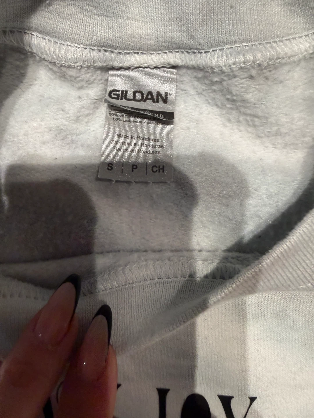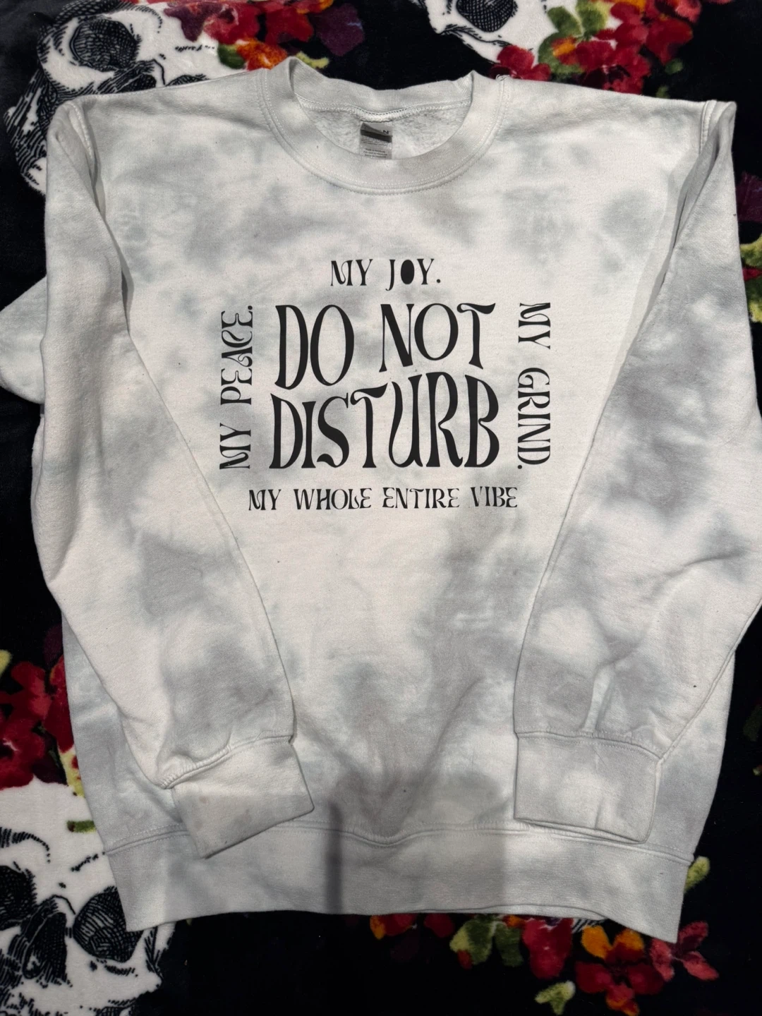 This Gildan sweatshirt features a tie-dye pattern and the "Do Not Disturb" graphic. It's made of a cotton-polyester blend. This sweater's print states "My Joy. Do Not Disturb. My Peace. My Grind. My Whole Entire Vibe." It's a size small.