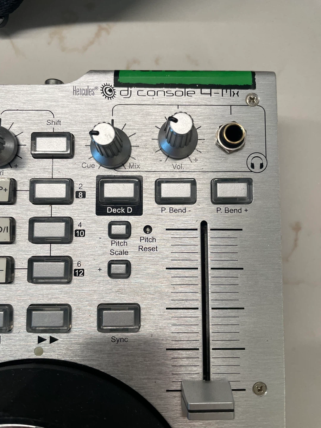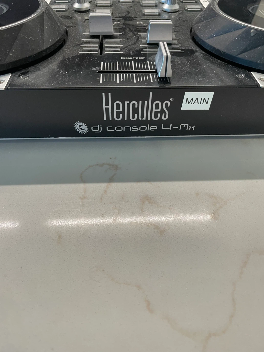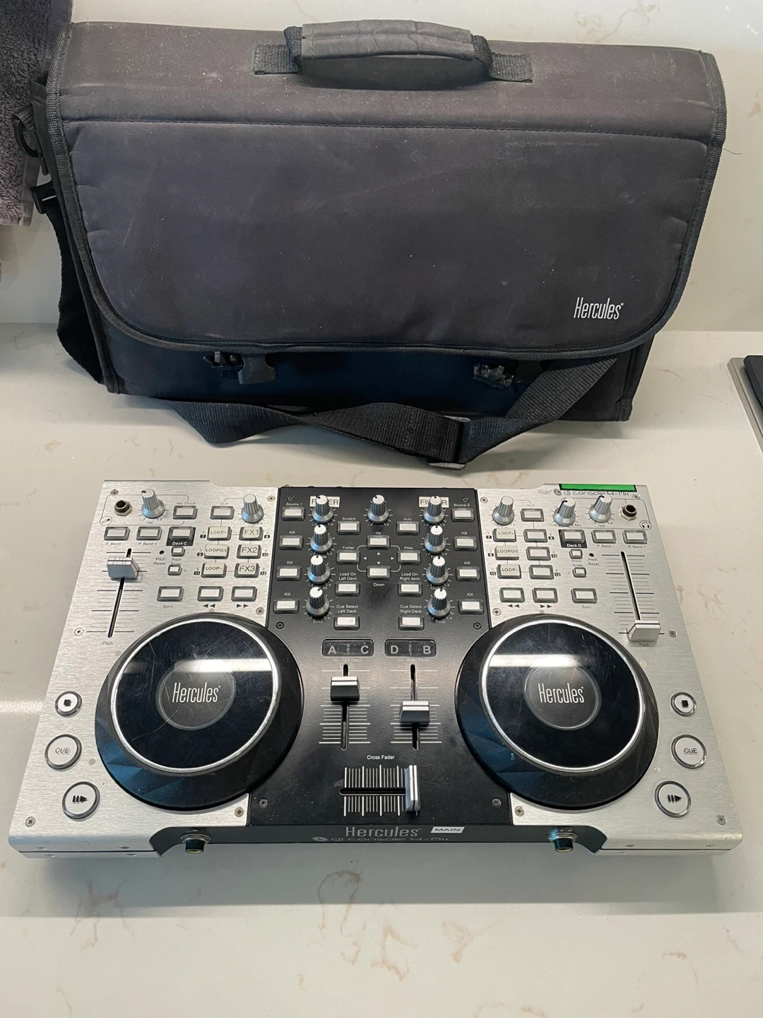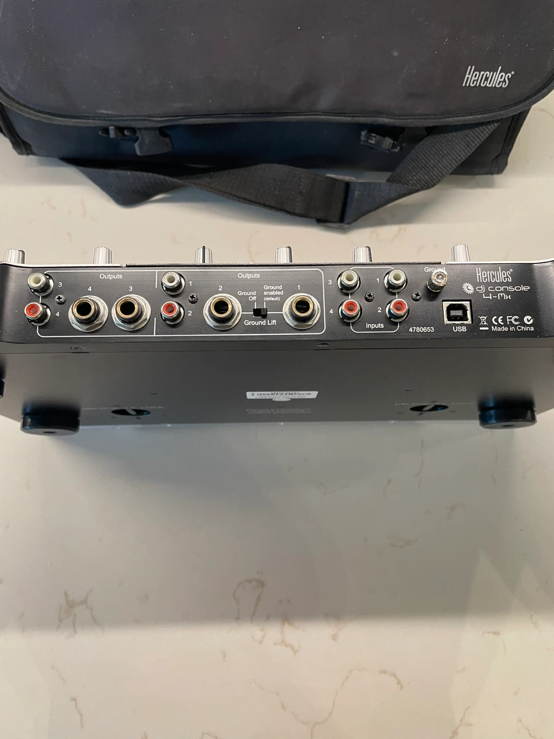 Hercules DJ Console 4-MX for sale. Comes with carrying bag. It has multiple input and output options for your setup. Includes knobs for volume and cue mix.