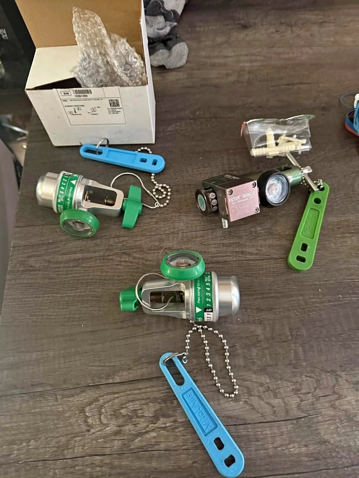 This is a compact, single-dial control device designed to deliver oxygen in a pulsed flow, which helps conserve the oxygen supply in a cylinder. Comes with tank key. 3 available. New price was $320, asking $250 each.