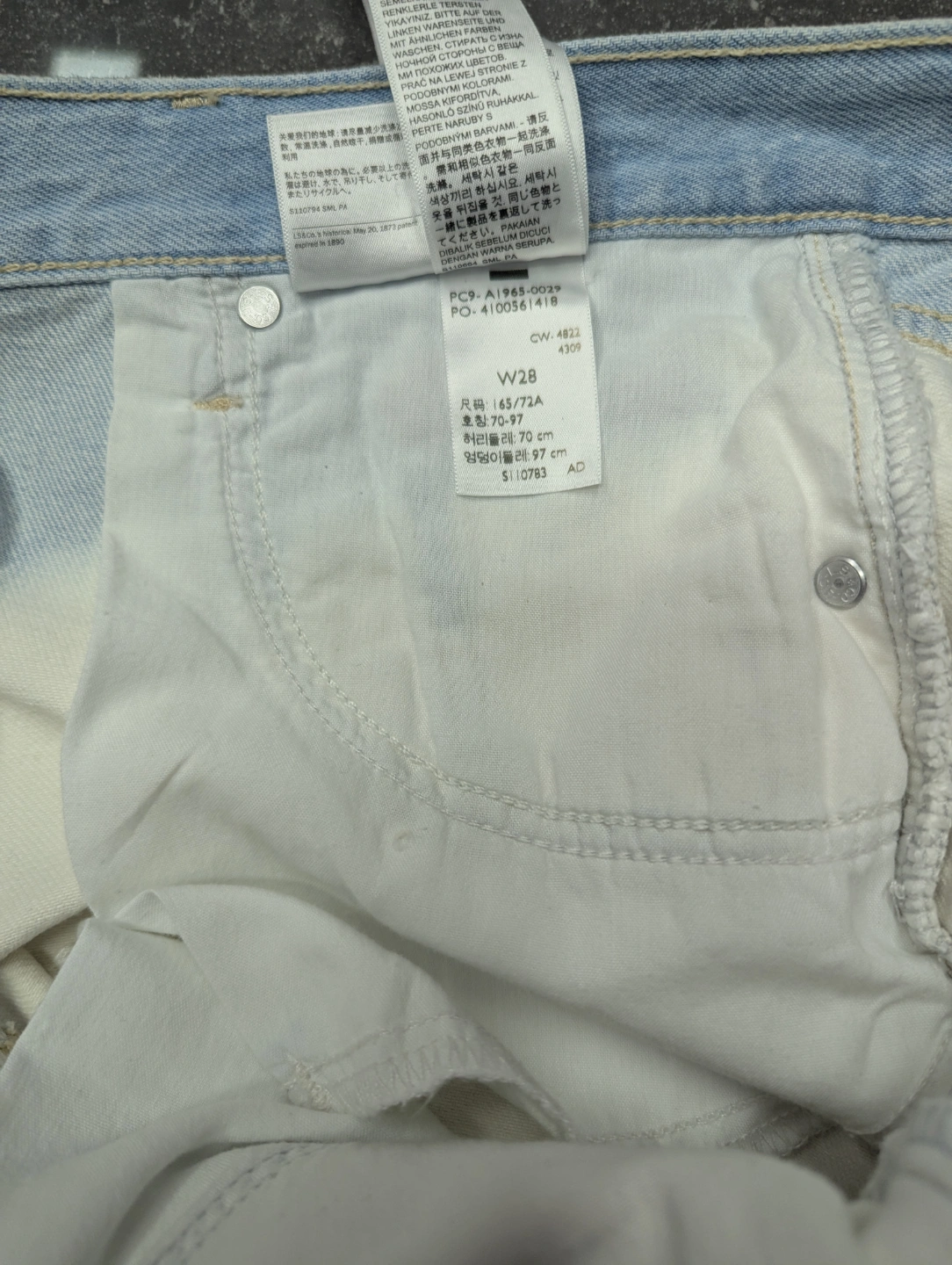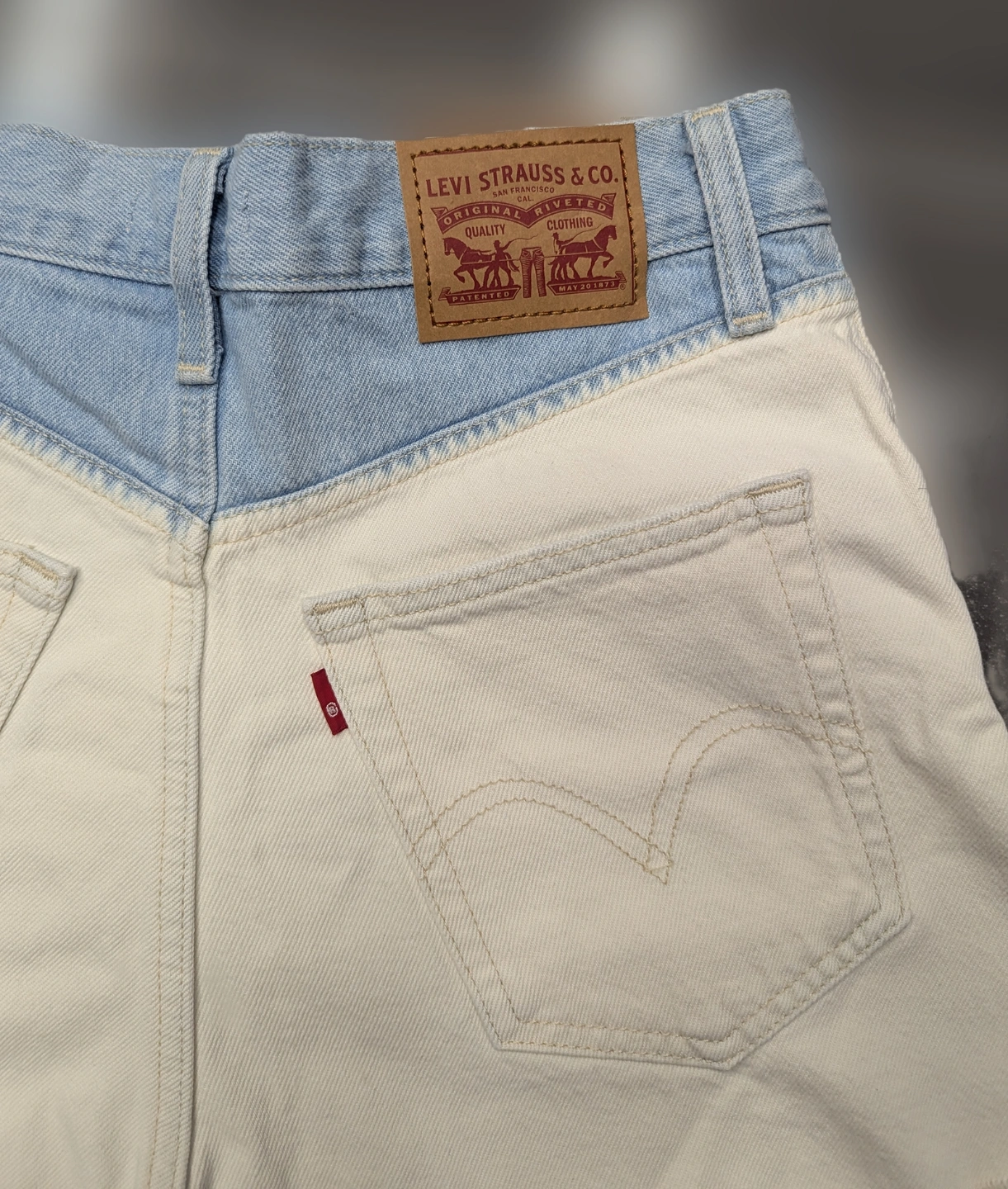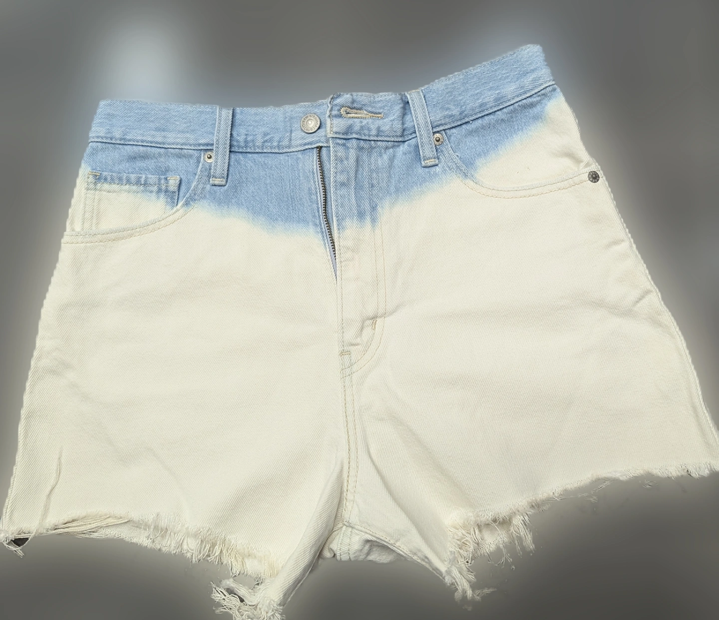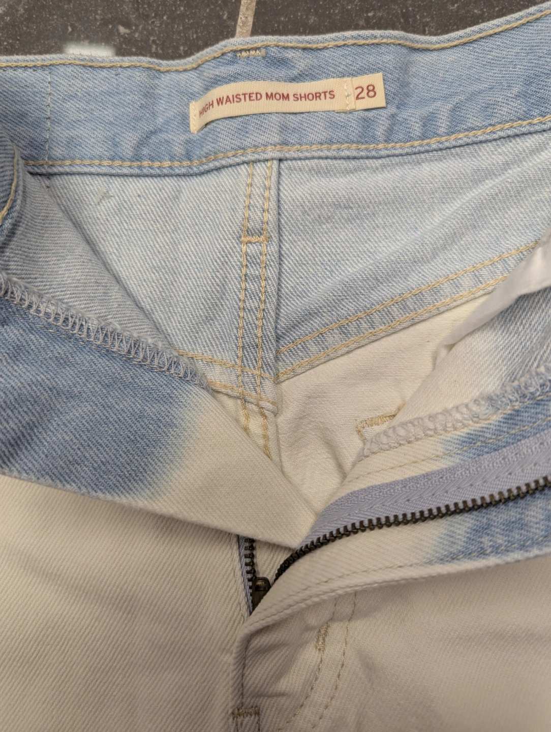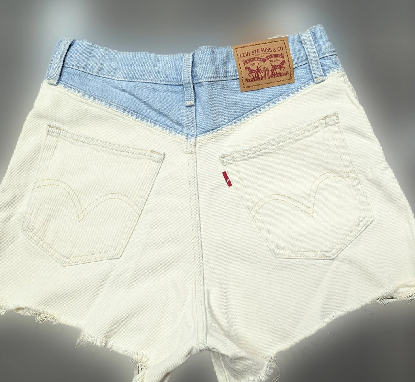 Levi's high-waisted mom shorts. Size 28. Two-tone colour design. Light wash denim top and off-white bottom. Frayed hem.