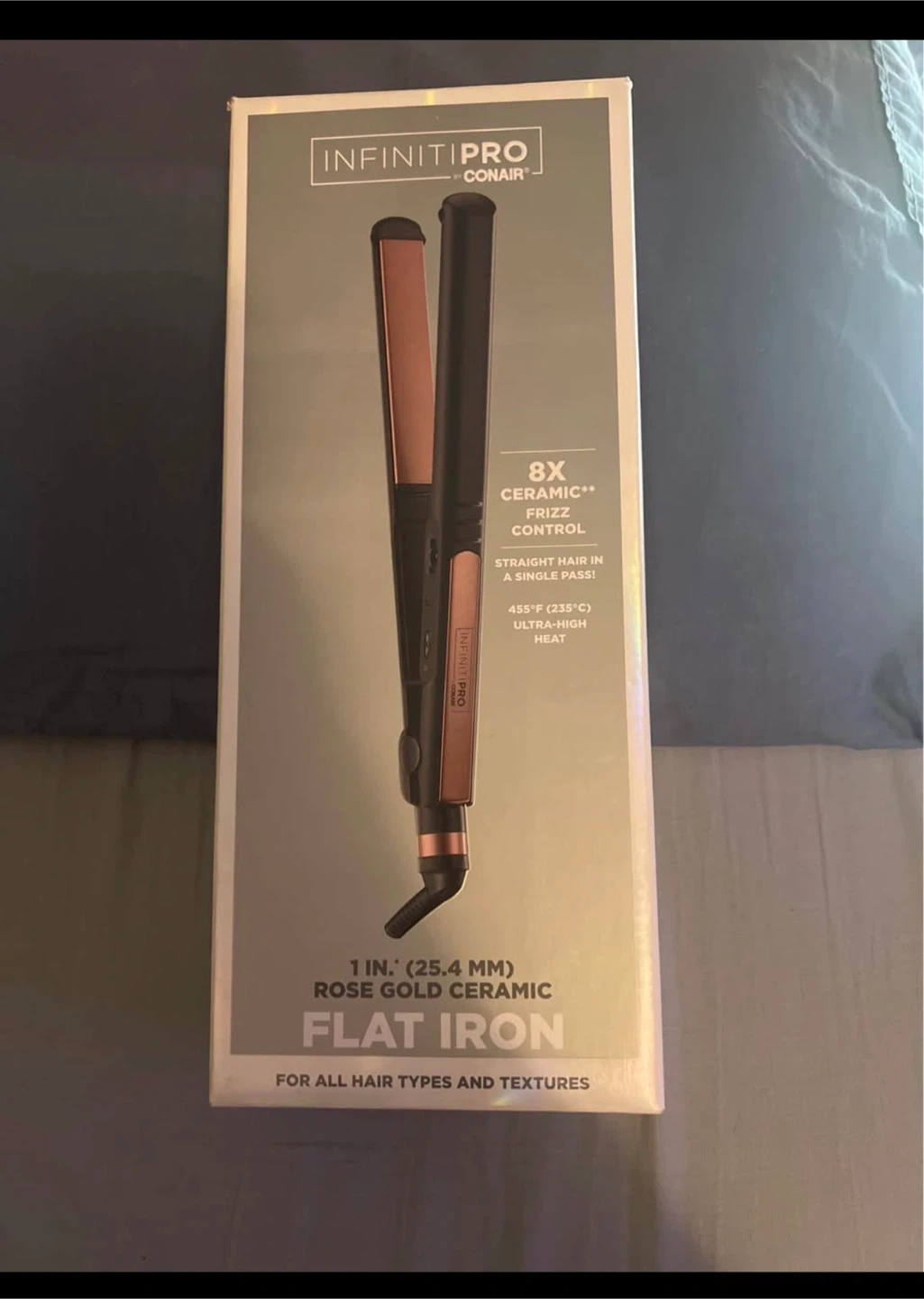 InfinitiPro by Conair 1-inch rose gold ceramic flat iron. It features 8x ceramic frizz control and ultra-high heat up to 455°F. Straightens hair in a single pass for all hair types and textures.
