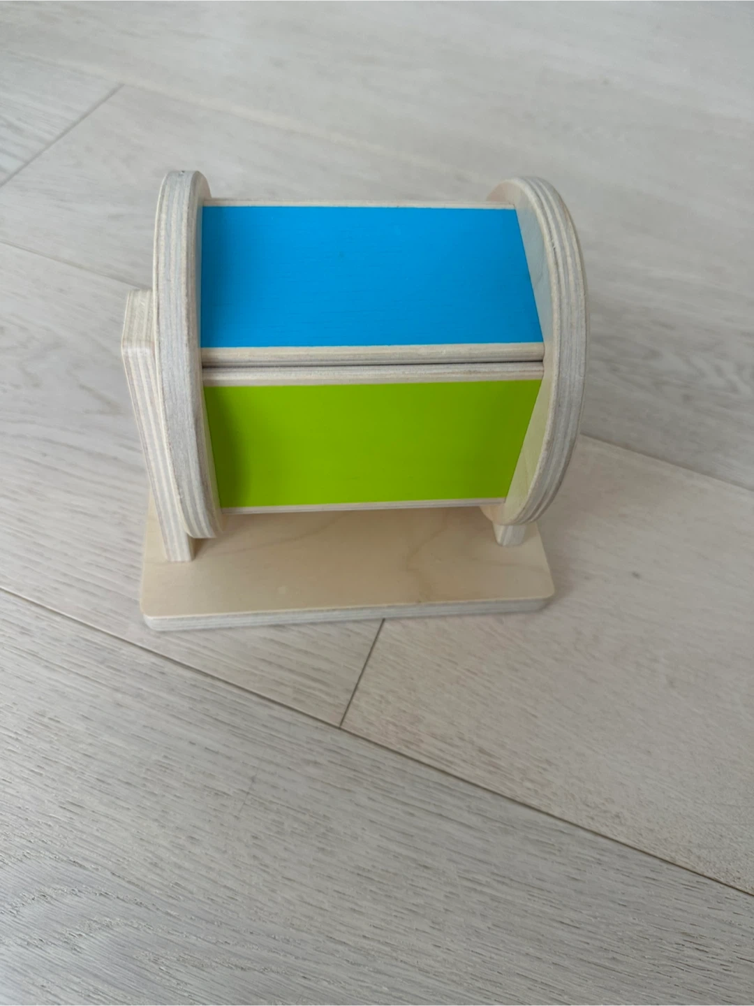 This wooden rolling drum toy is made with natural wood and has colourful panels. It's a fun tactile and visual toy for little ones. Encourages motor skills and sensory exploration.