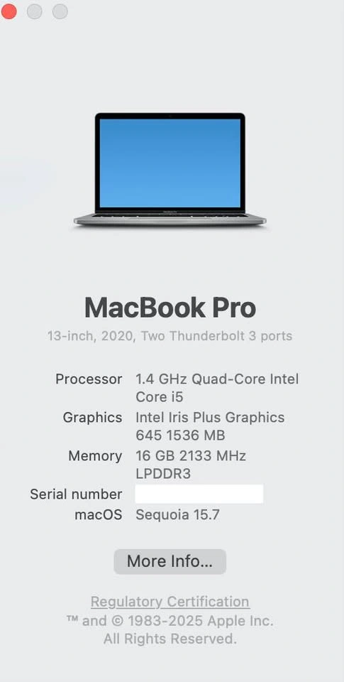 Excellent condition. Running most updated OS for the device (Sequoia). Clean, well taken care of. Babied since I had it brand new. 16 GB 2133 MHz LPDDR3, 1TB SSD hard drive, 1.4 GHz Quad-Core Intel Core i5Touch Bar; everything works perfectly, zero issues. Pickup 172 and 1b. South Surrey.