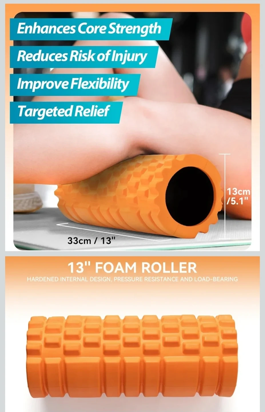 31This 13-inch foam roller is in excellent condition and ready to help you enhance your core strength, reduce the risk of injury, and improve your flexibility! It provides targeted relief and is made of high-density EVA foam for premium quality. The hardened internal design ensures pressure resistance and load-bearing capabilities. It's perfect for palm, thumb, and finger zone massage, offering gentle and deeper relief for muscle fatigue