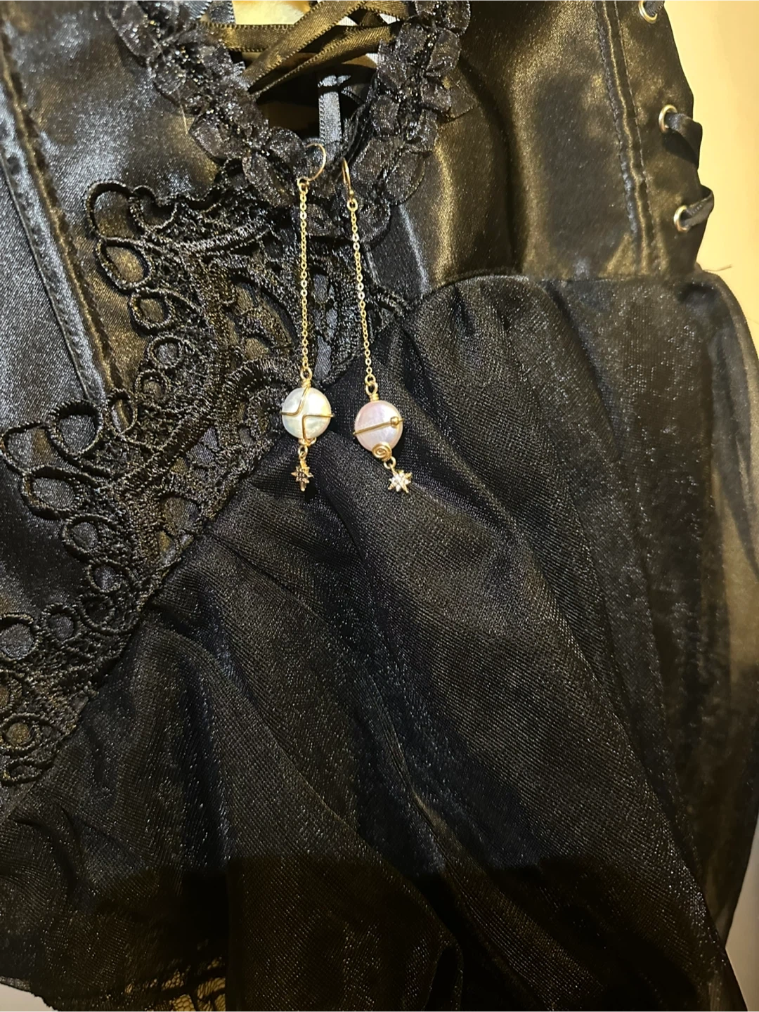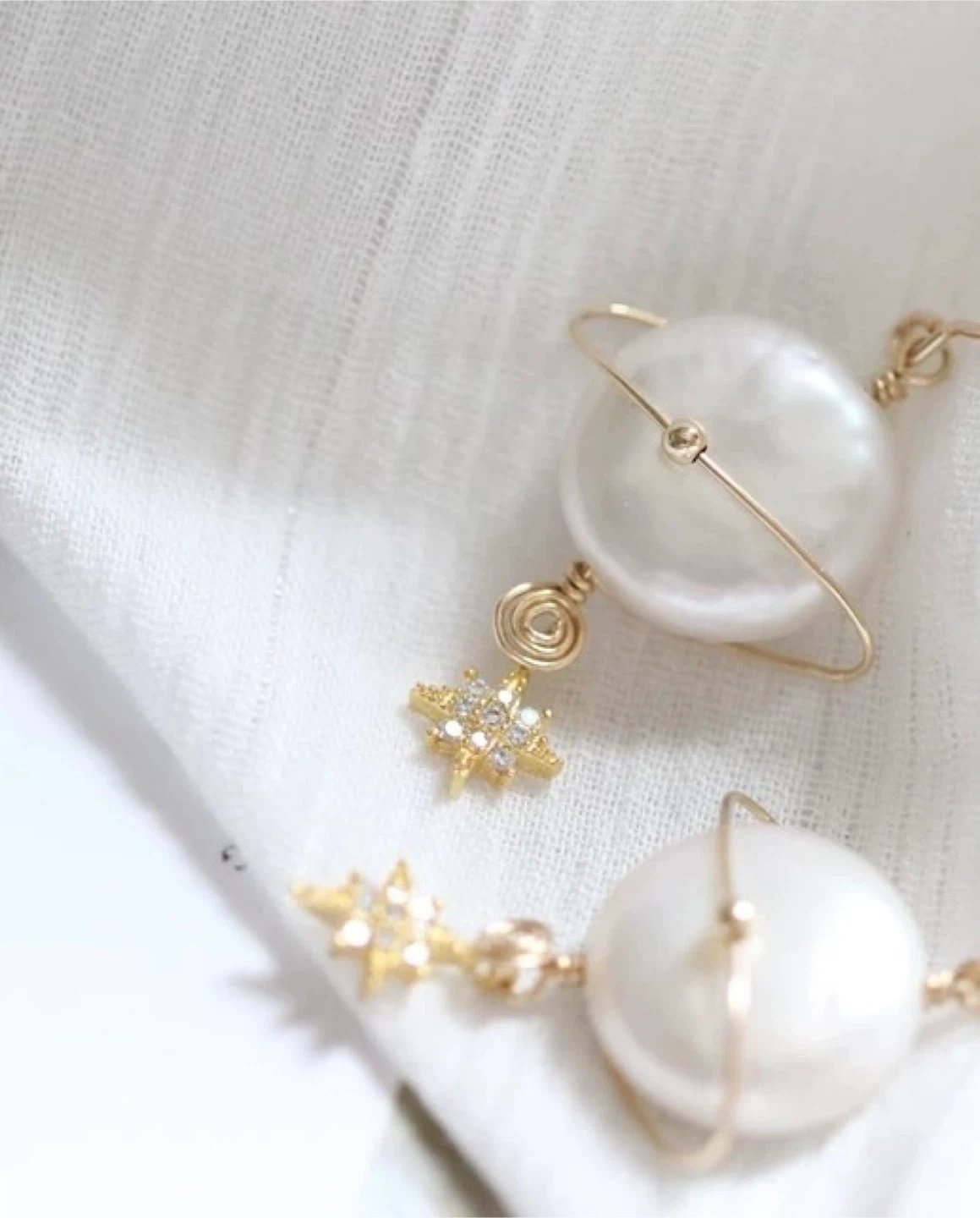 12These are a pair of lovely drop earrings. They feature a pearl-like bead encased in a gold-tone wire, suspended from a delicate gold chain. A small star charm dangles at the bottom, adding a touch of sparkle to these beautiful earrings
