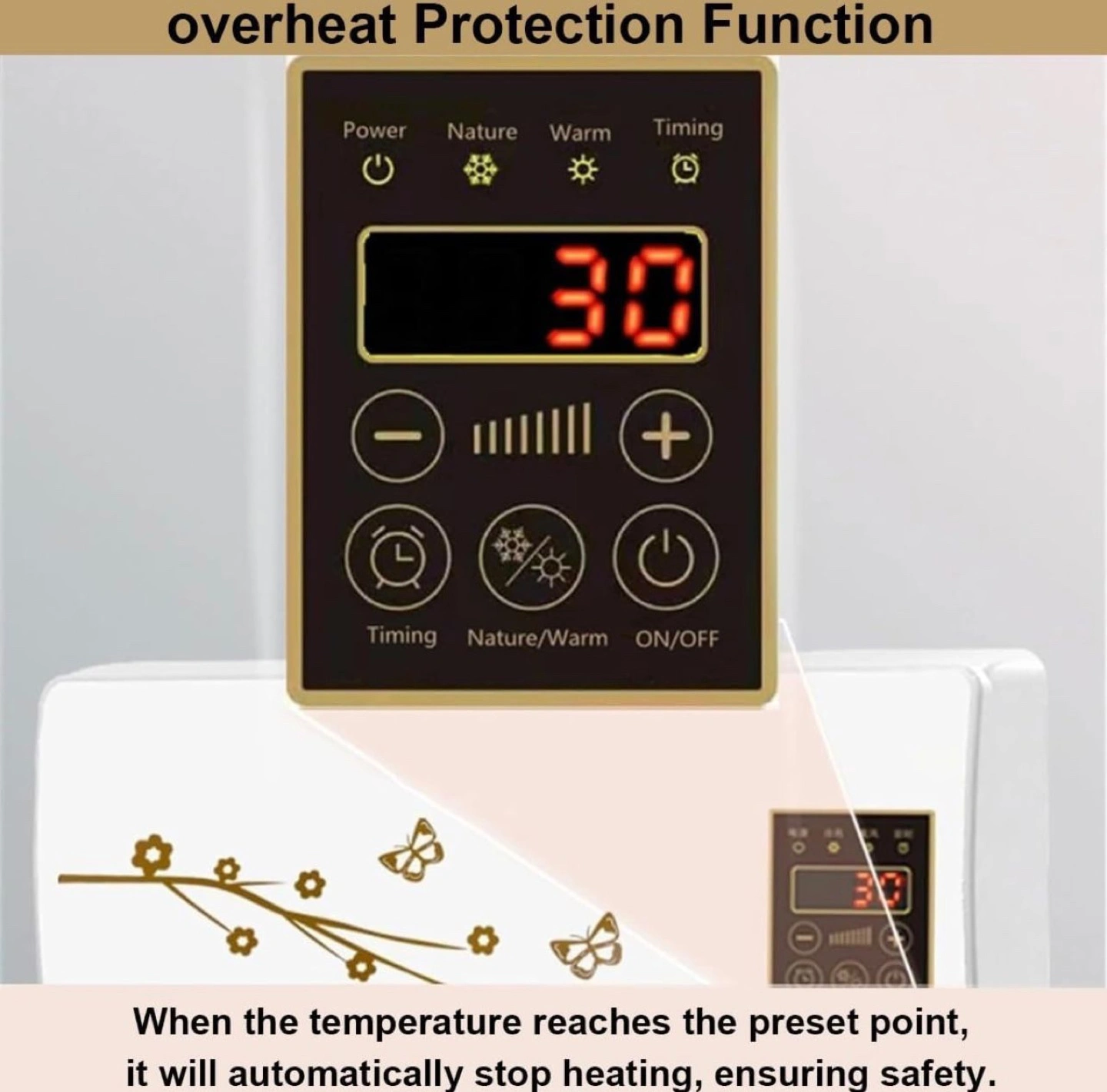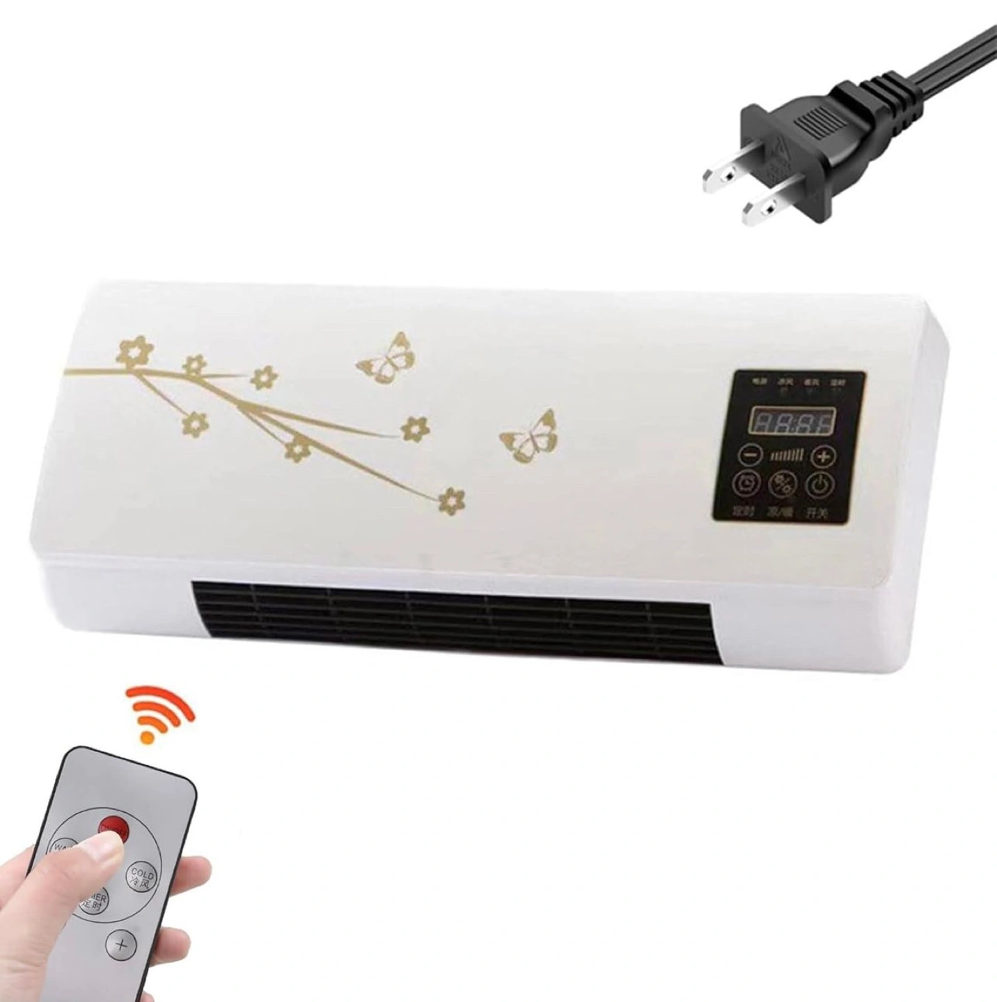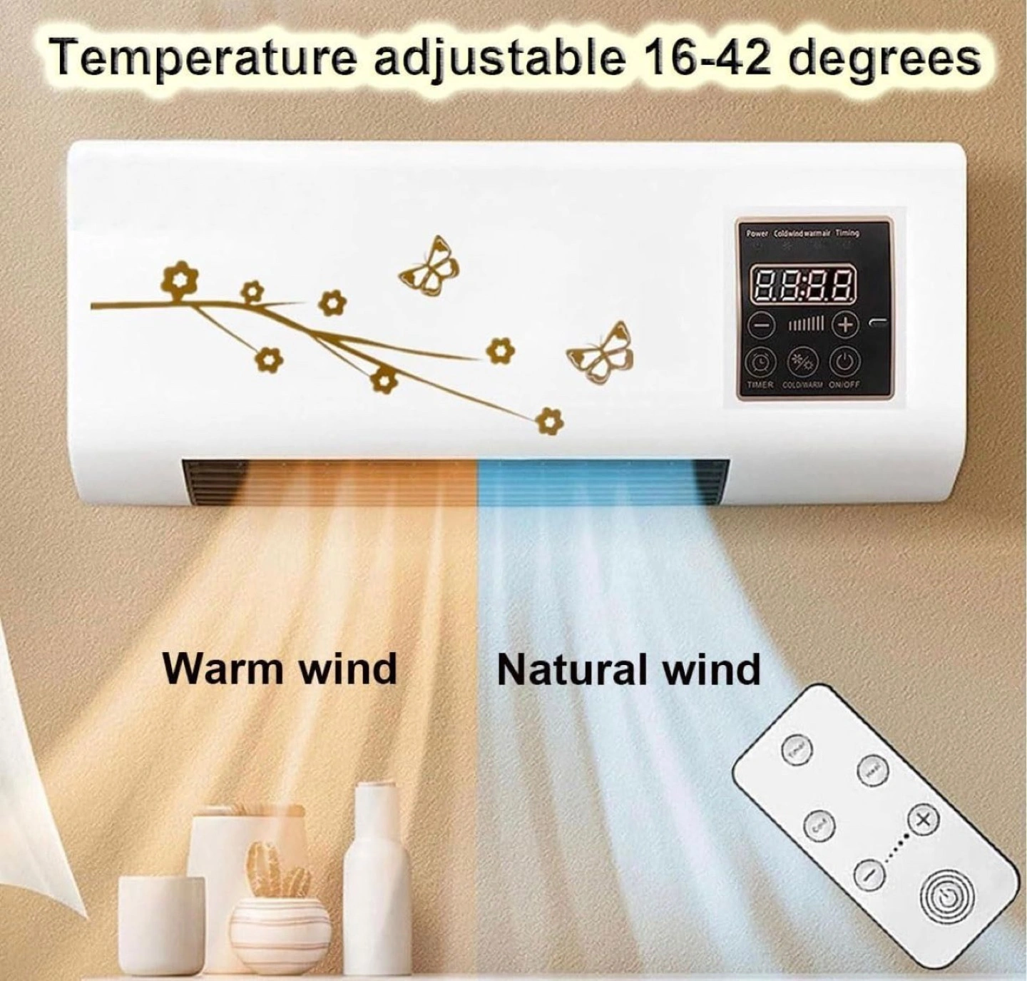 83Electric wall heater with remote control. Features warm and natural wind settings. Adjustable temperature from 16-42 degrees. Overheat protection function. Includes a built-in timer.