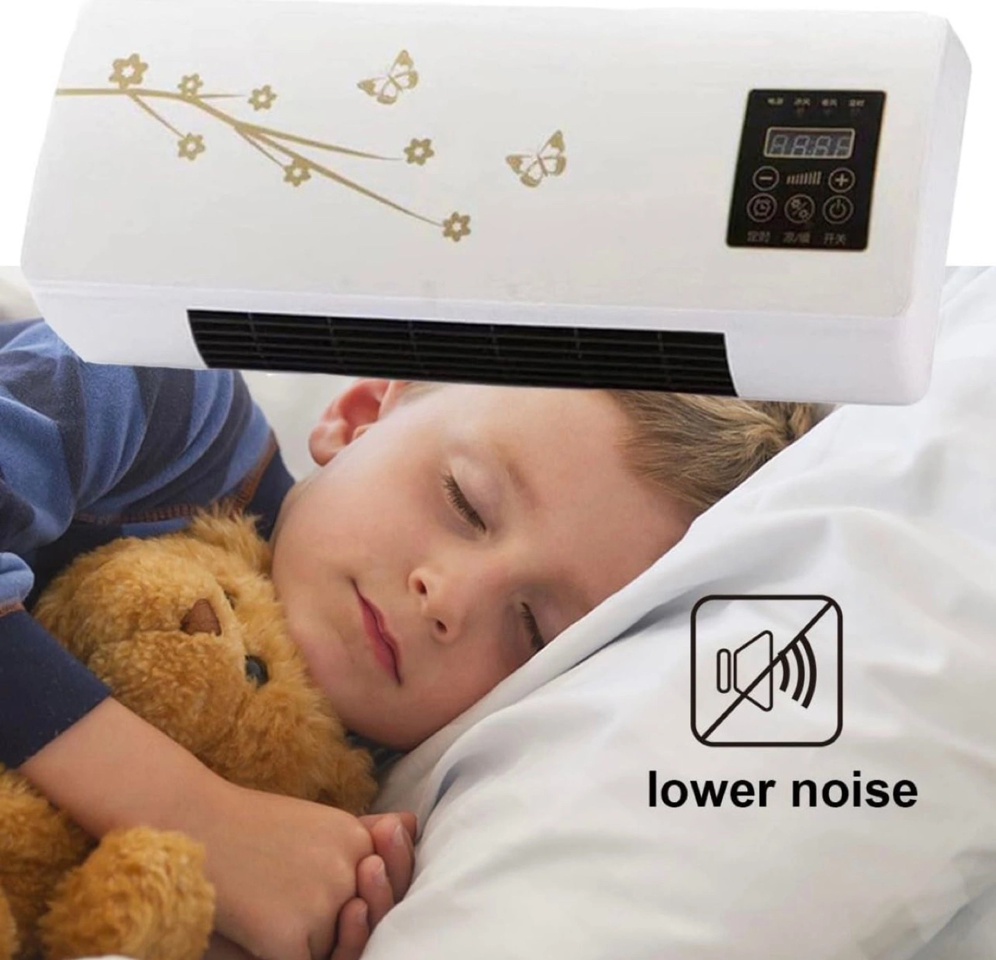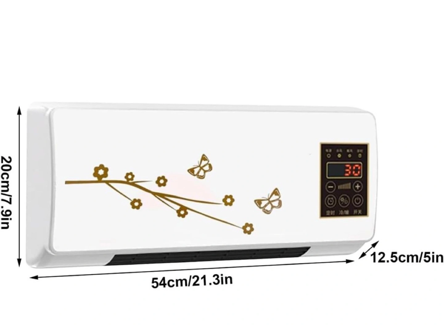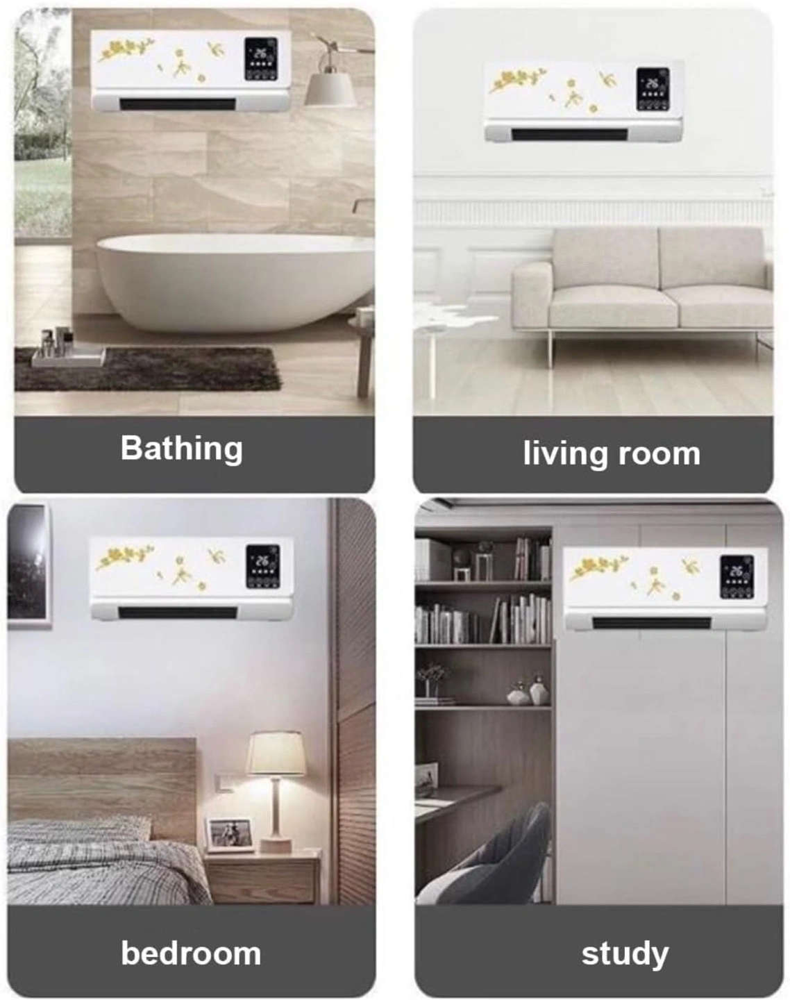 83Electric wall heater with remote control. Features warm and natural wind settings. Adjustable temperature from 16-42 degrees. Overheat protection function. Includes a built-in timer.