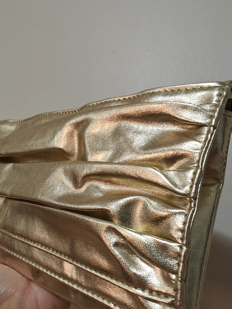 gold convertible clutch with ruffle detail, comes with strap to be used as handbag. sturdy metal clasps on straps, hidden magnetic closure under flap. zippered pocket inside.