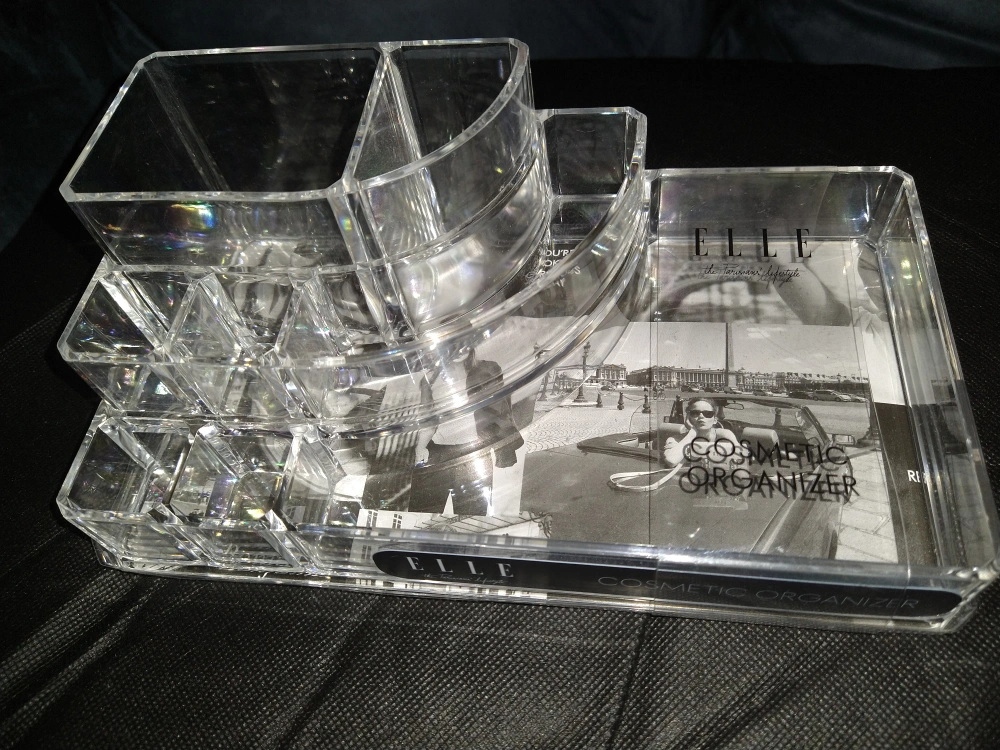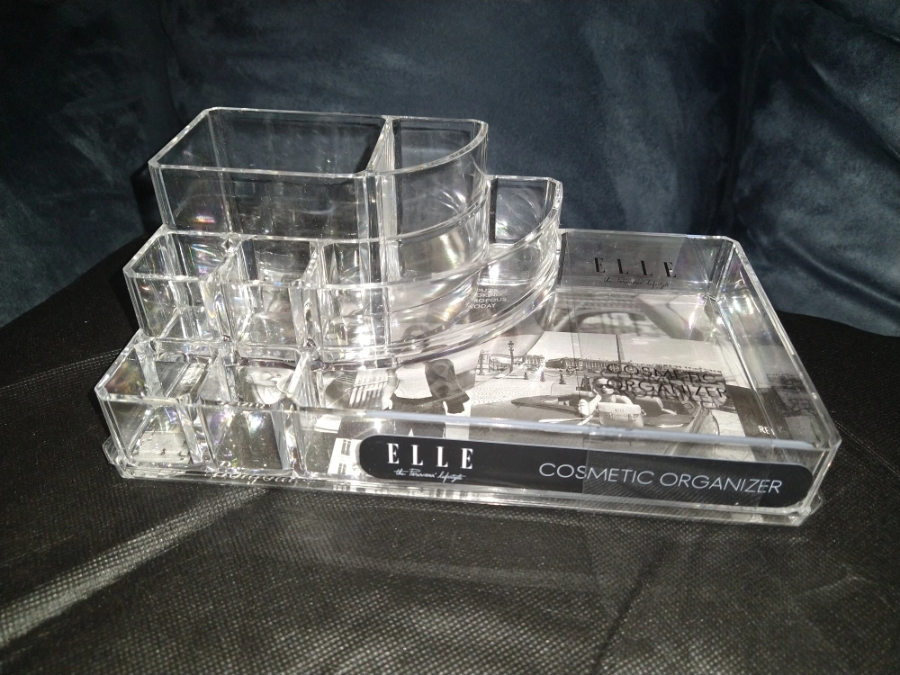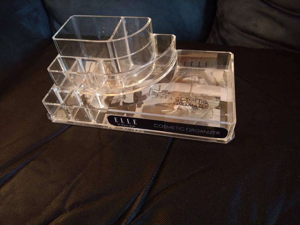 Up for dibs is a cosmetic organizer, by Elle. It has never been used, and still has a plastic strip around it.