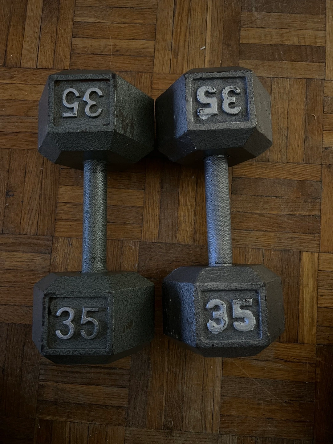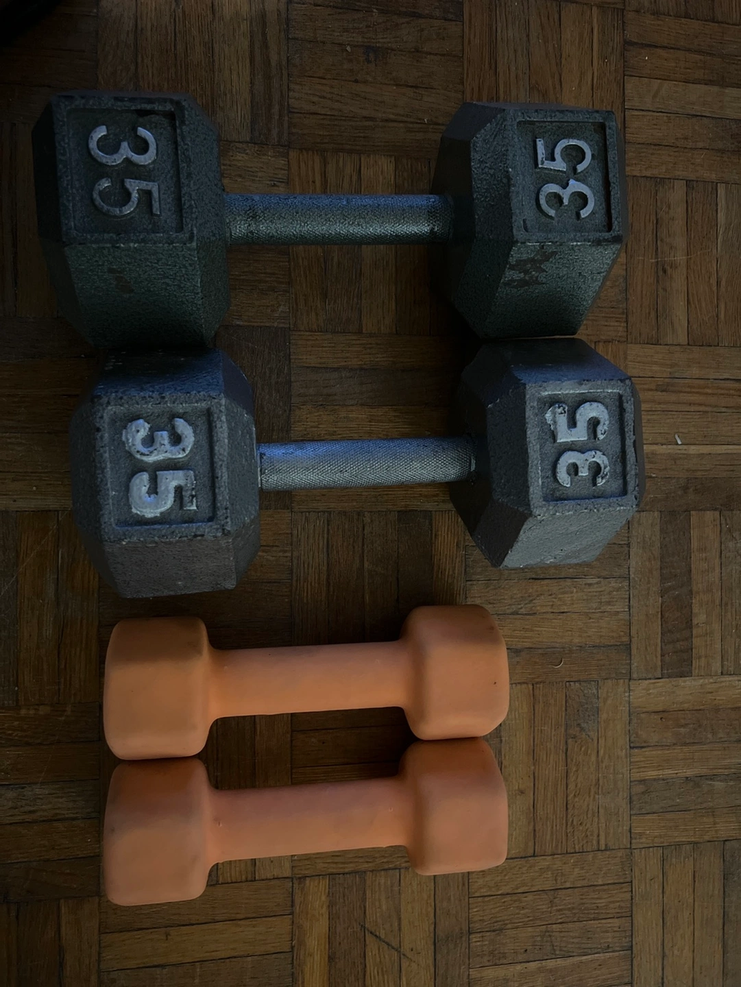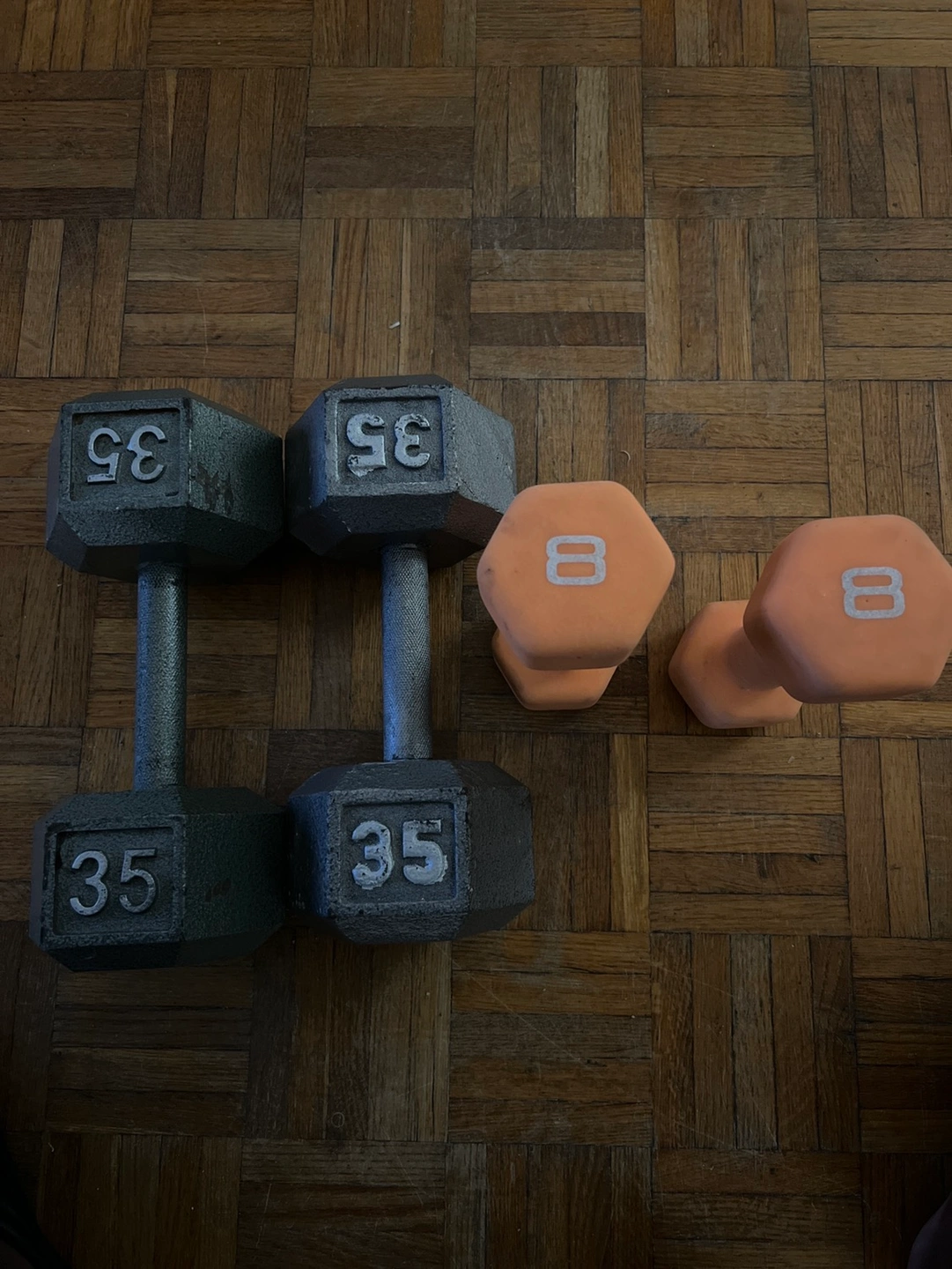 Two 35 pound dumbbells and two 8 pound dumbbells
