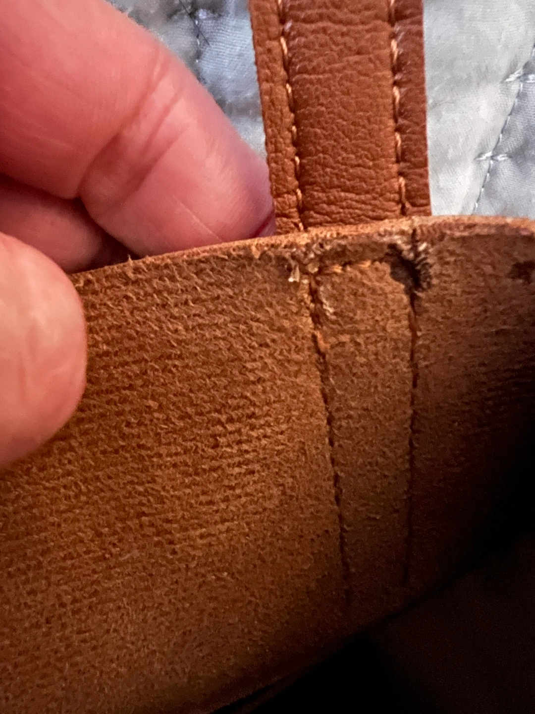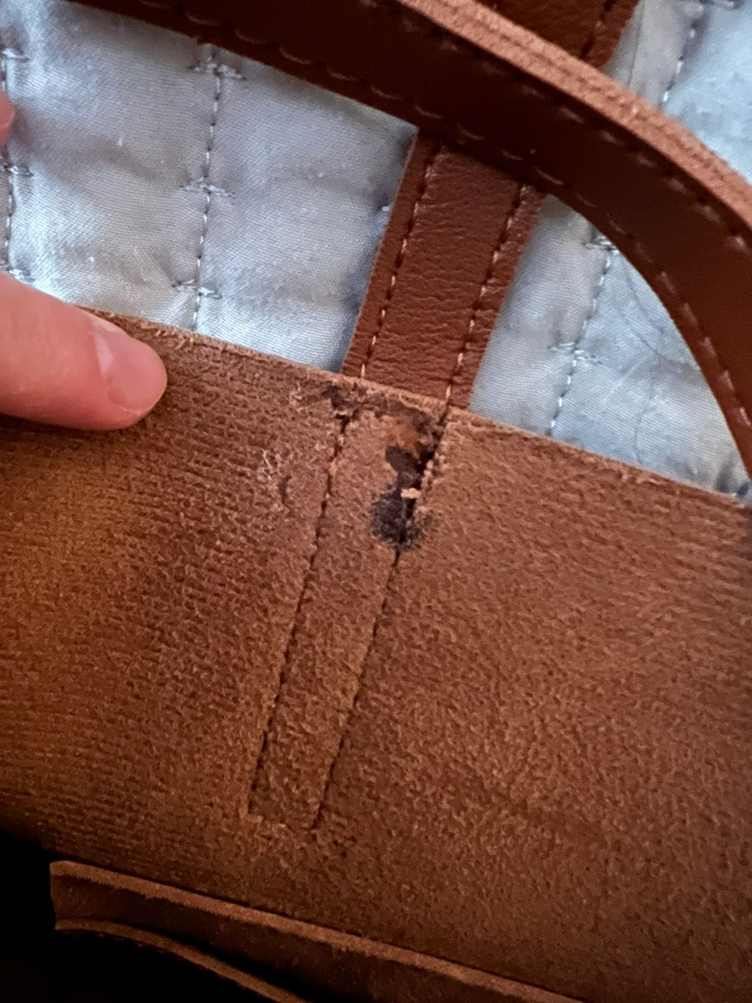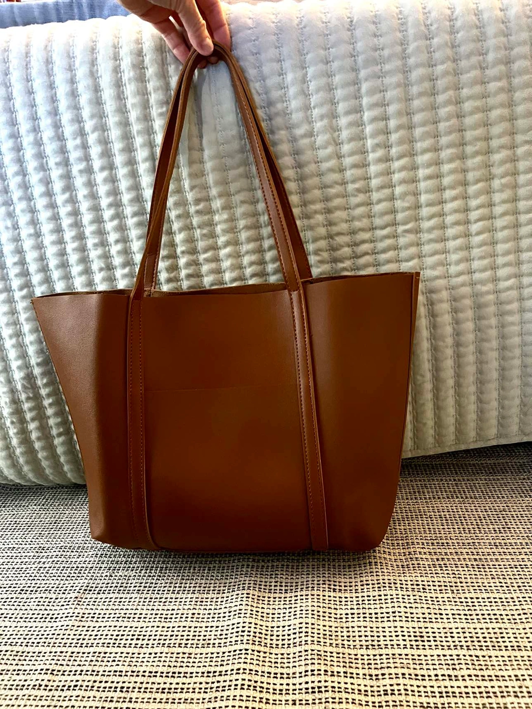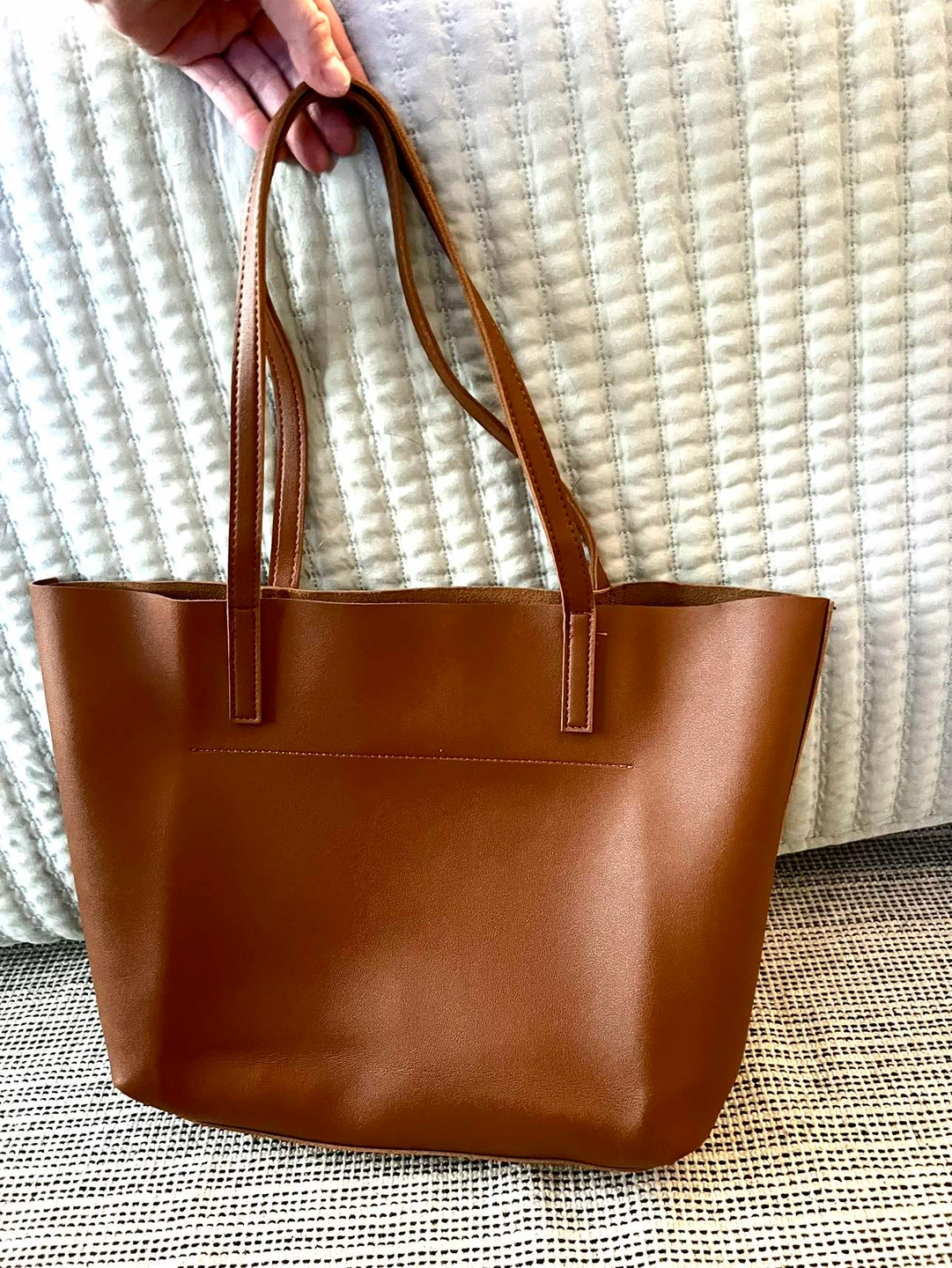Henny & Lev Danielle tote in cognac shade. It does not have a zipper or closure and has one outer open pocket and two inner slit pockets. Double straps hang about 10”. Measures 11” x 17” flat. Would fit a small laptop. There’s a small defect on the inside where strap inserts. Looks like glue.