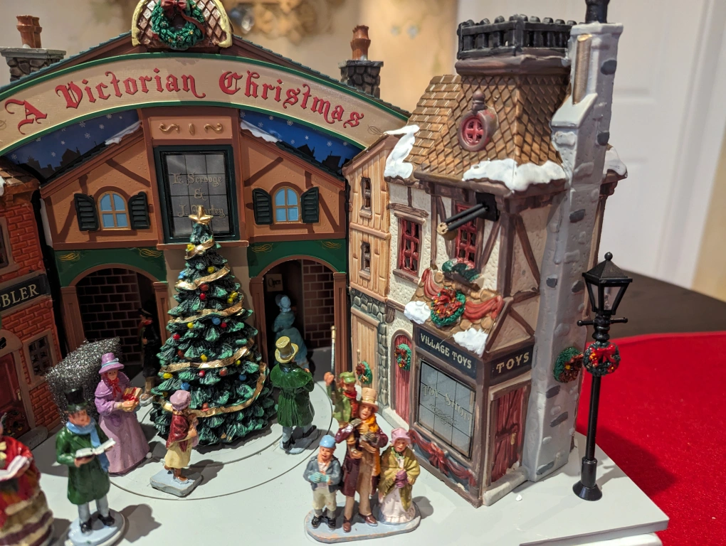 This is a beautiful, detailed musical display. It is electric, with an on/off switch. It is based on "A Christmas Carol" and features Tiny Tim on his father's shoulders. The figures rotate, while the song "God rest ye Merry Gentlemen", plays.