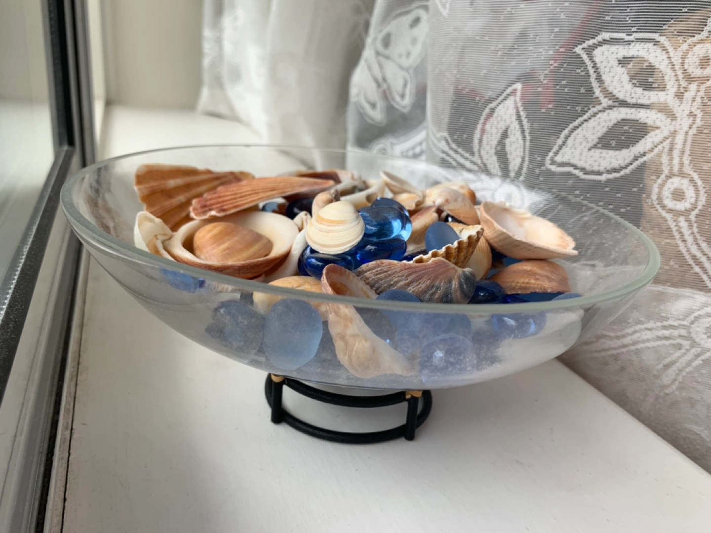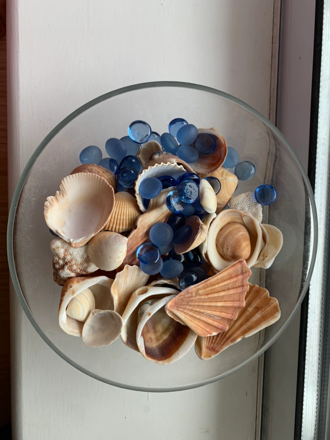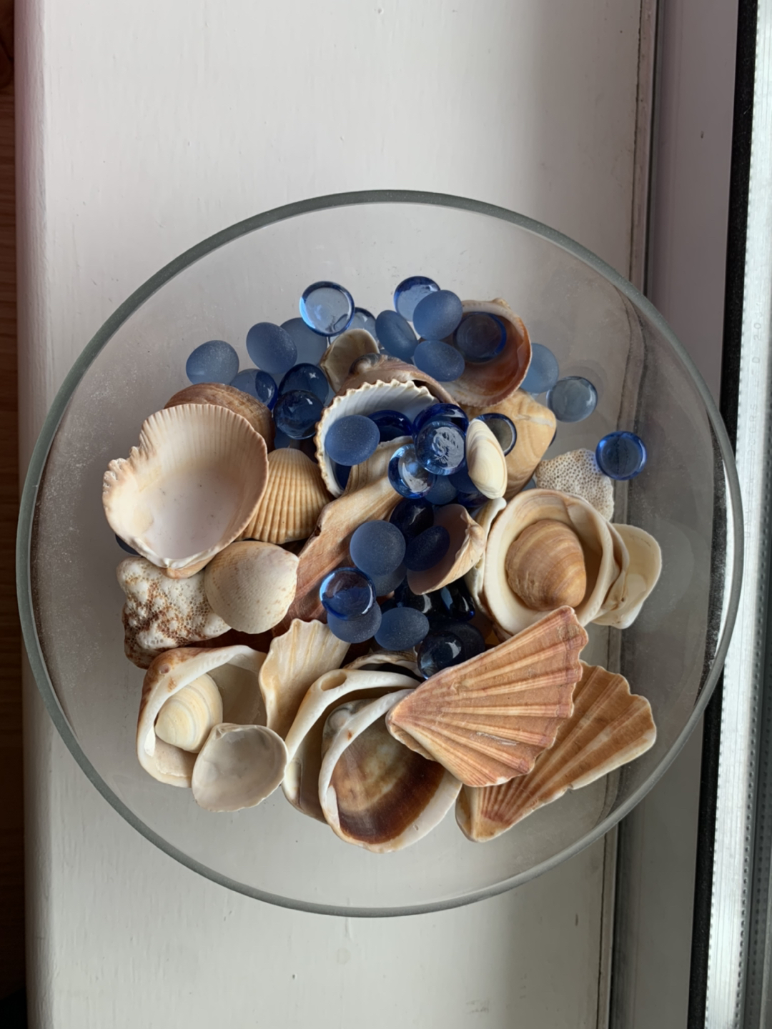 Sea Shell collected from Hawaii and Pacific Ocean Beaches. With Blue Glasses in a clear bowl. Nice decor at home!