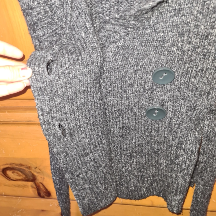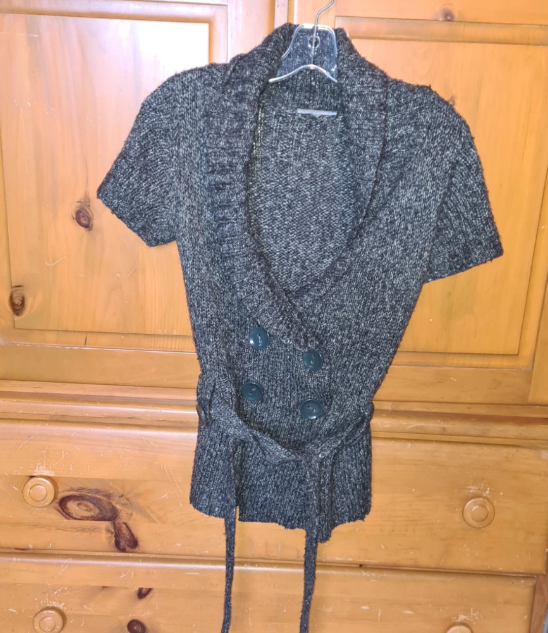 Sleeveless winter knitted cardigan. Close with 2 sets of big buttons + a knitted belt. Button details on shoulders and sides of the belt. Size S Can also meet in Downtown.