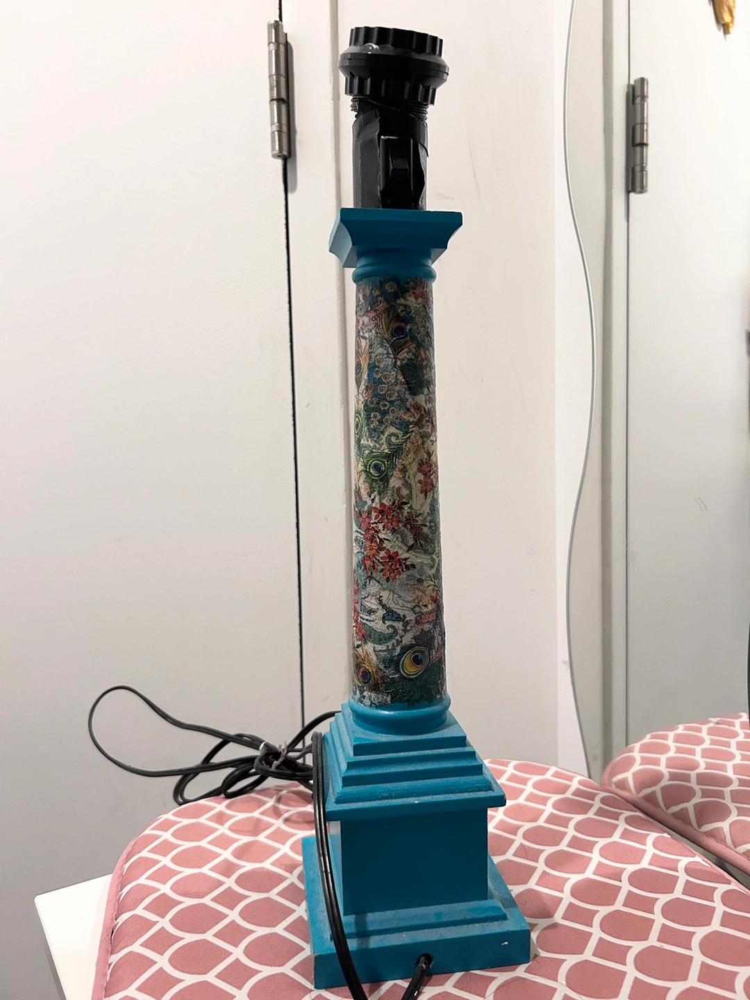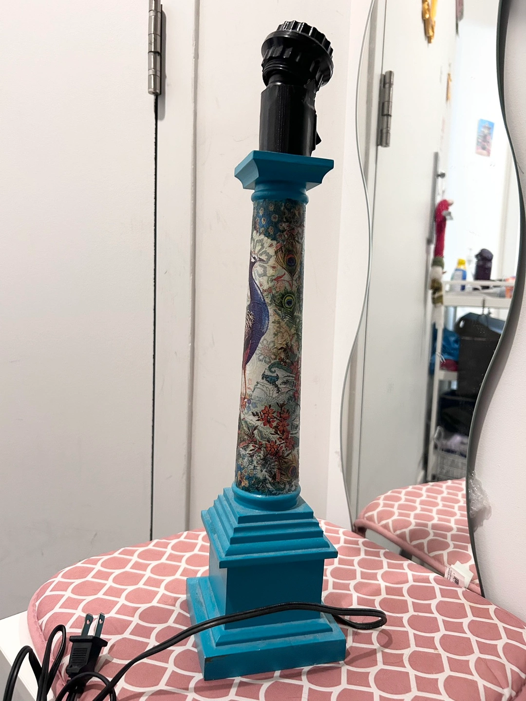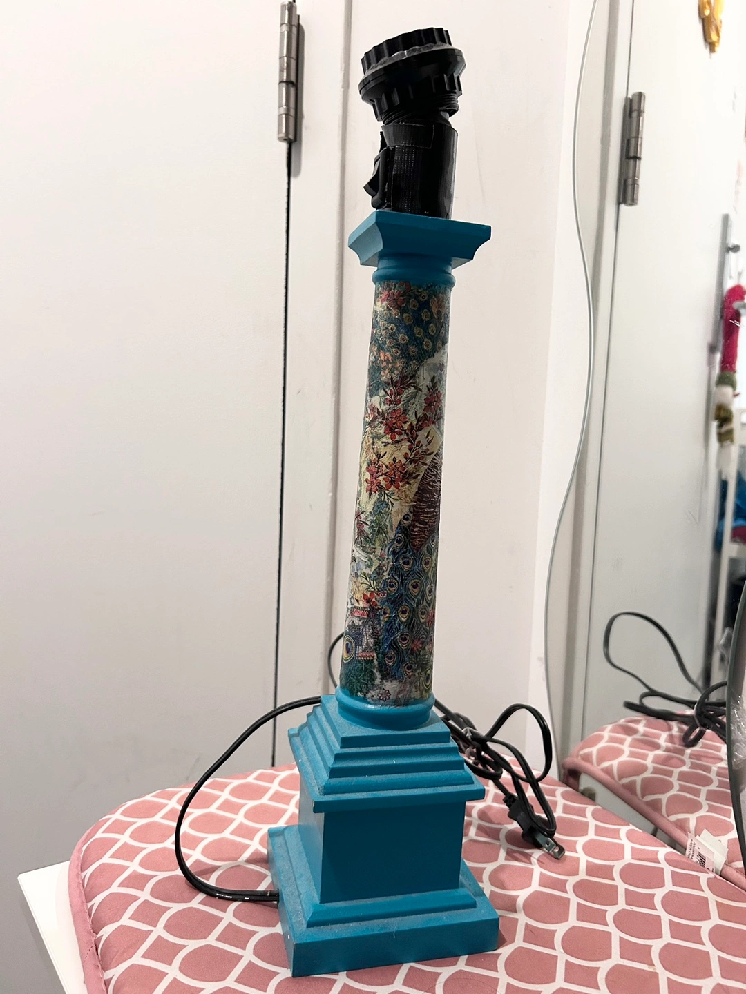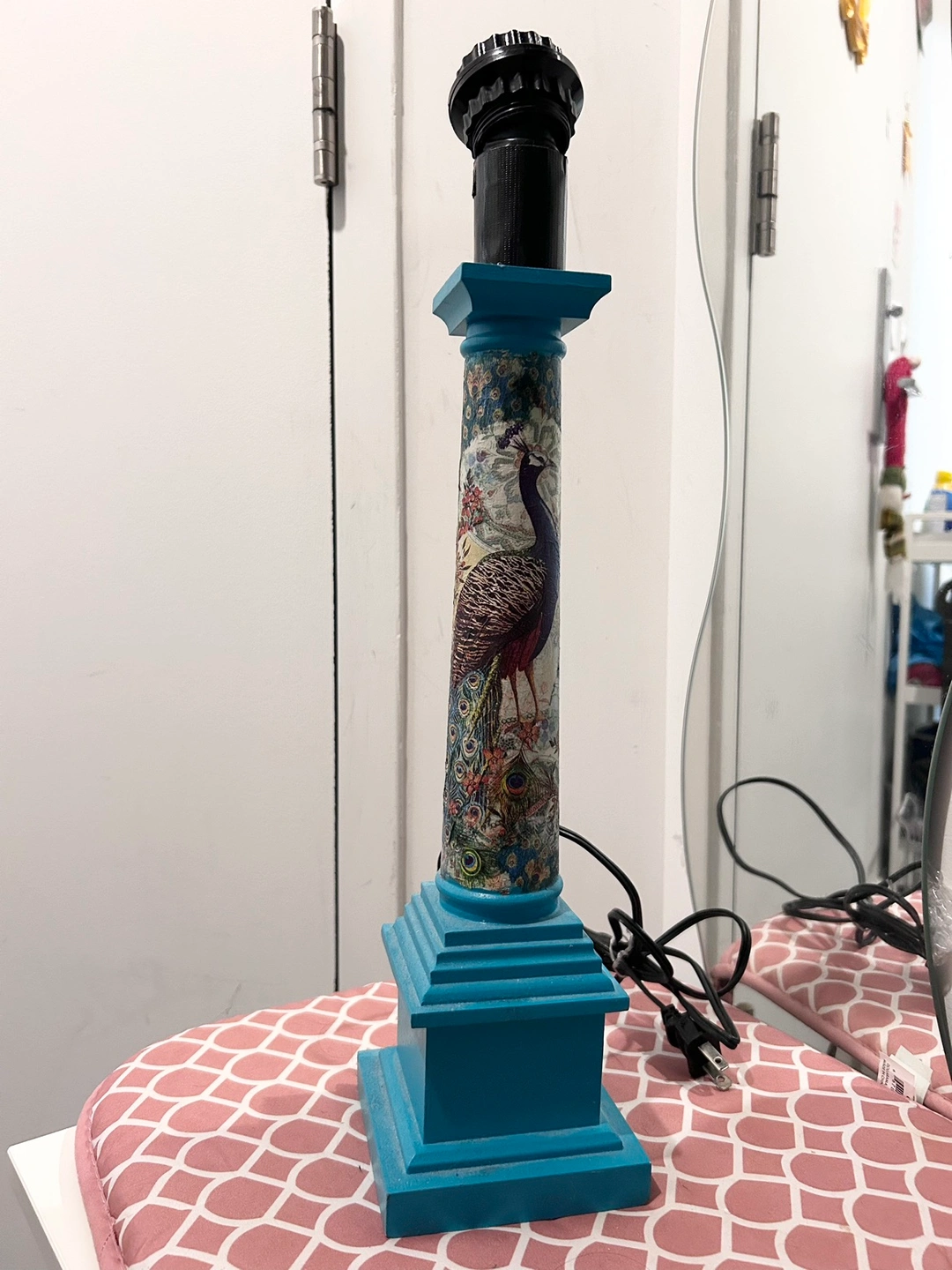 Beautiful wooden lamp base with peacock and floral design, for someone crafty/handy to repurpose into a working lamp (needs repair), candle stick holder, or whatever you want to turn it into to give it a second life!