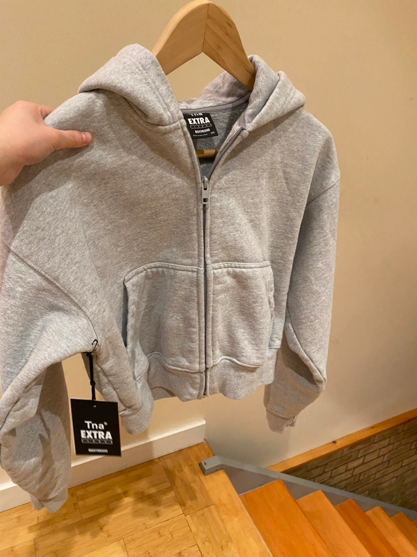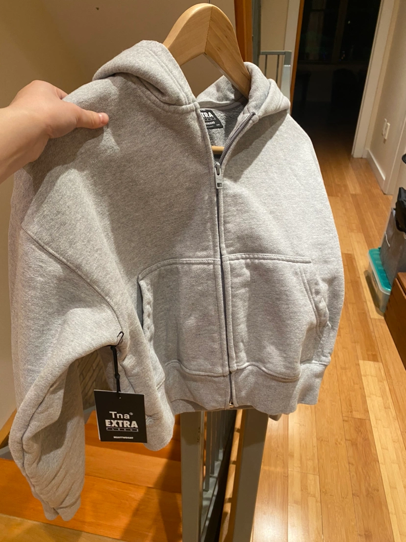 Aritzia grey new with tags boxy zip up Size:xxs but fits a xs better No damage Bought during Black Friday, can’t return Retails:$85 Selling:$65 negotiable