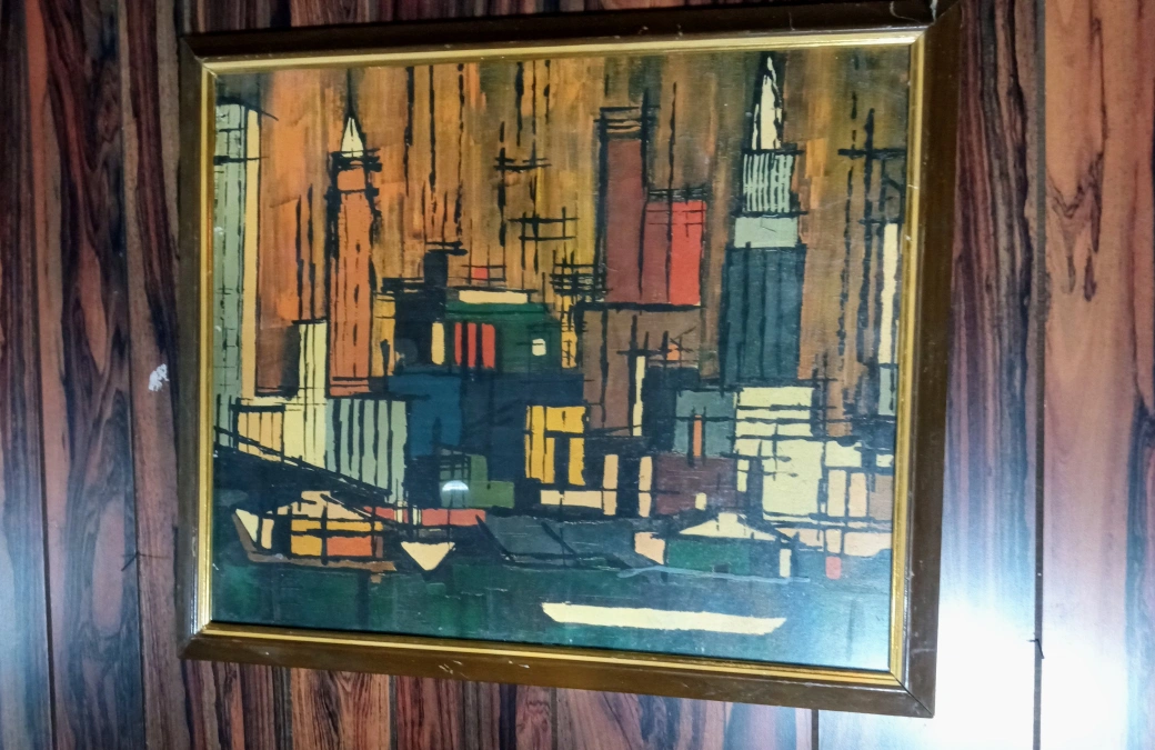 A city painting by Montez Turner who was a contemporary genre painter in the 1960s