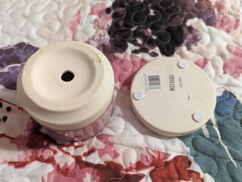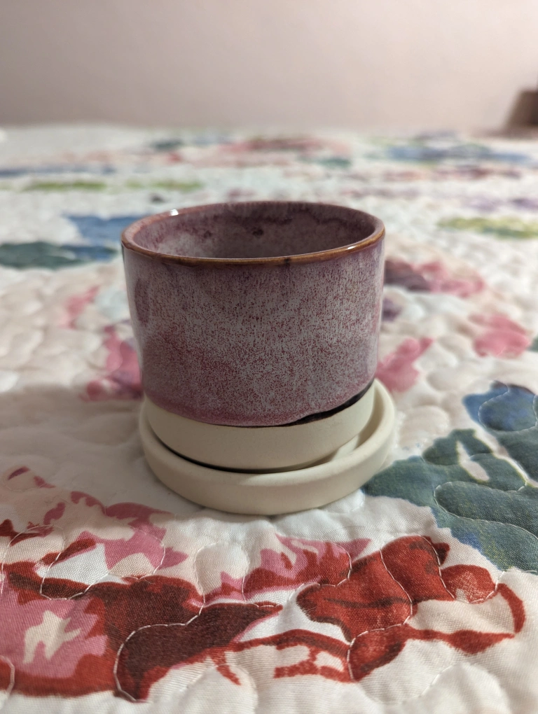 Cute ceramic planter pot + saucer in cream and rose colours. Measures approximately 3 inches diameter x 3.25 inches high.
