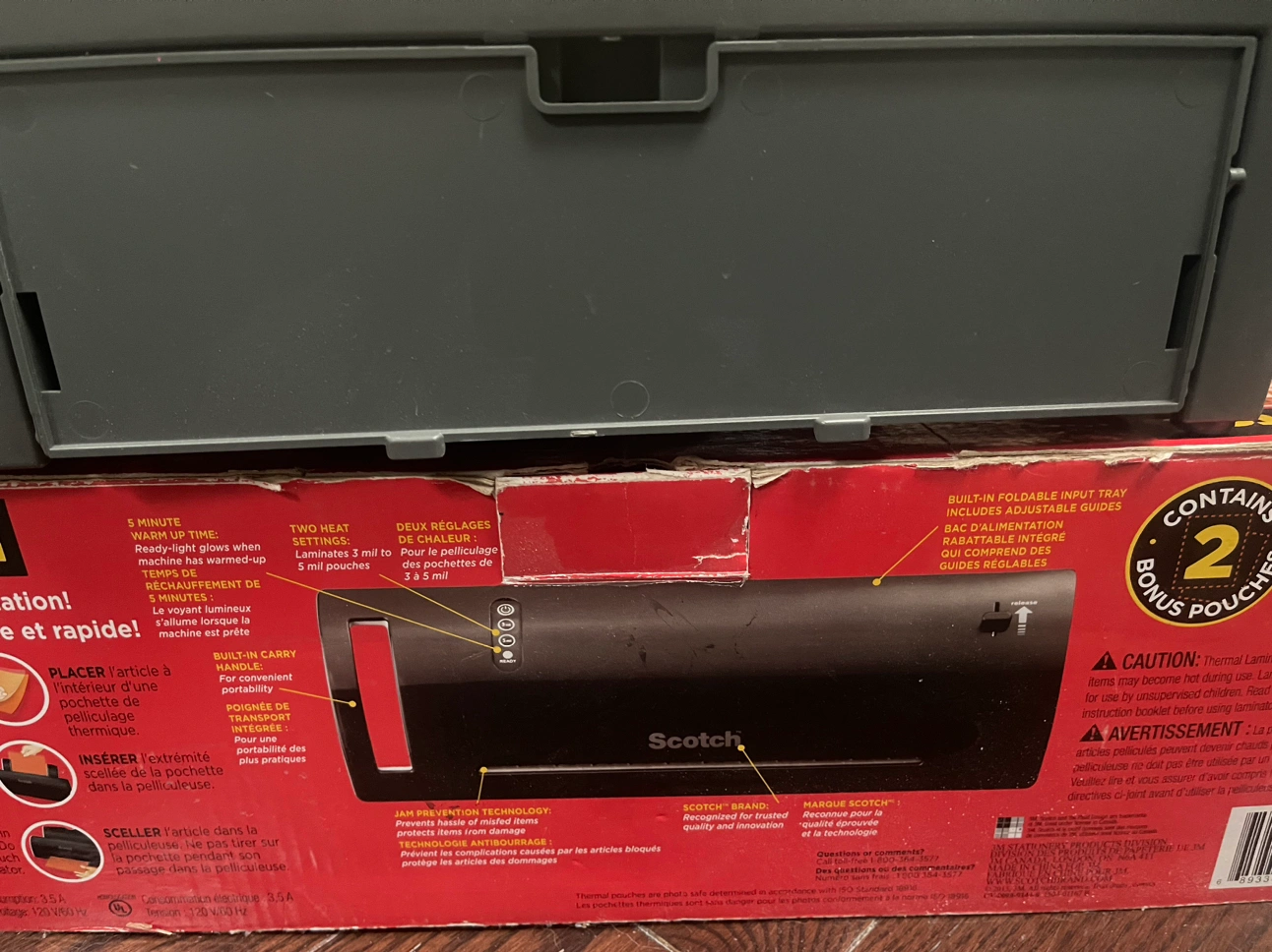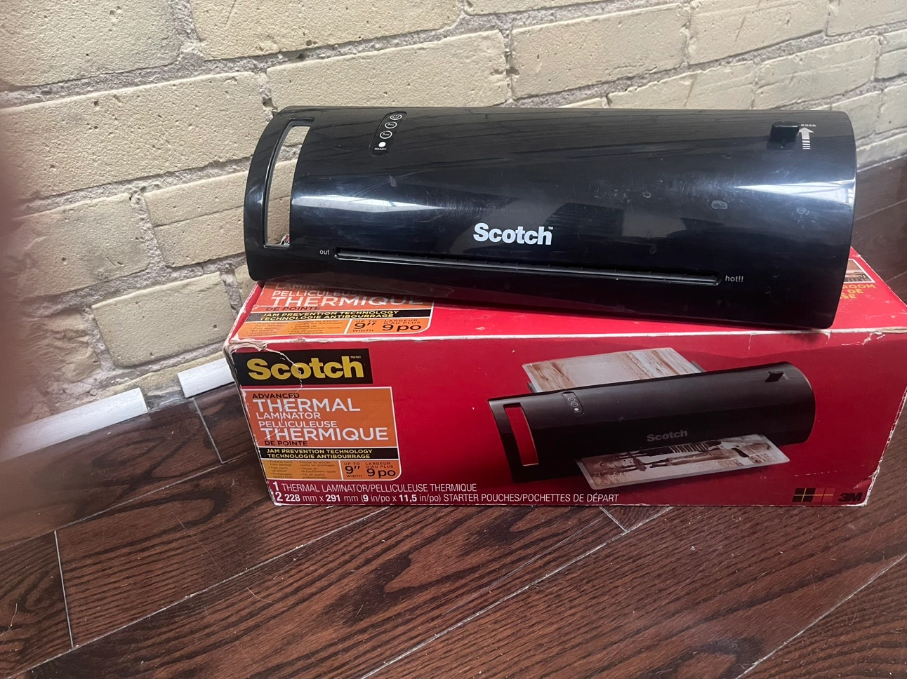 Scotch brand thermal laminator for up to 9” wide, jam prevention technology, fold out/fold in receiving tray.