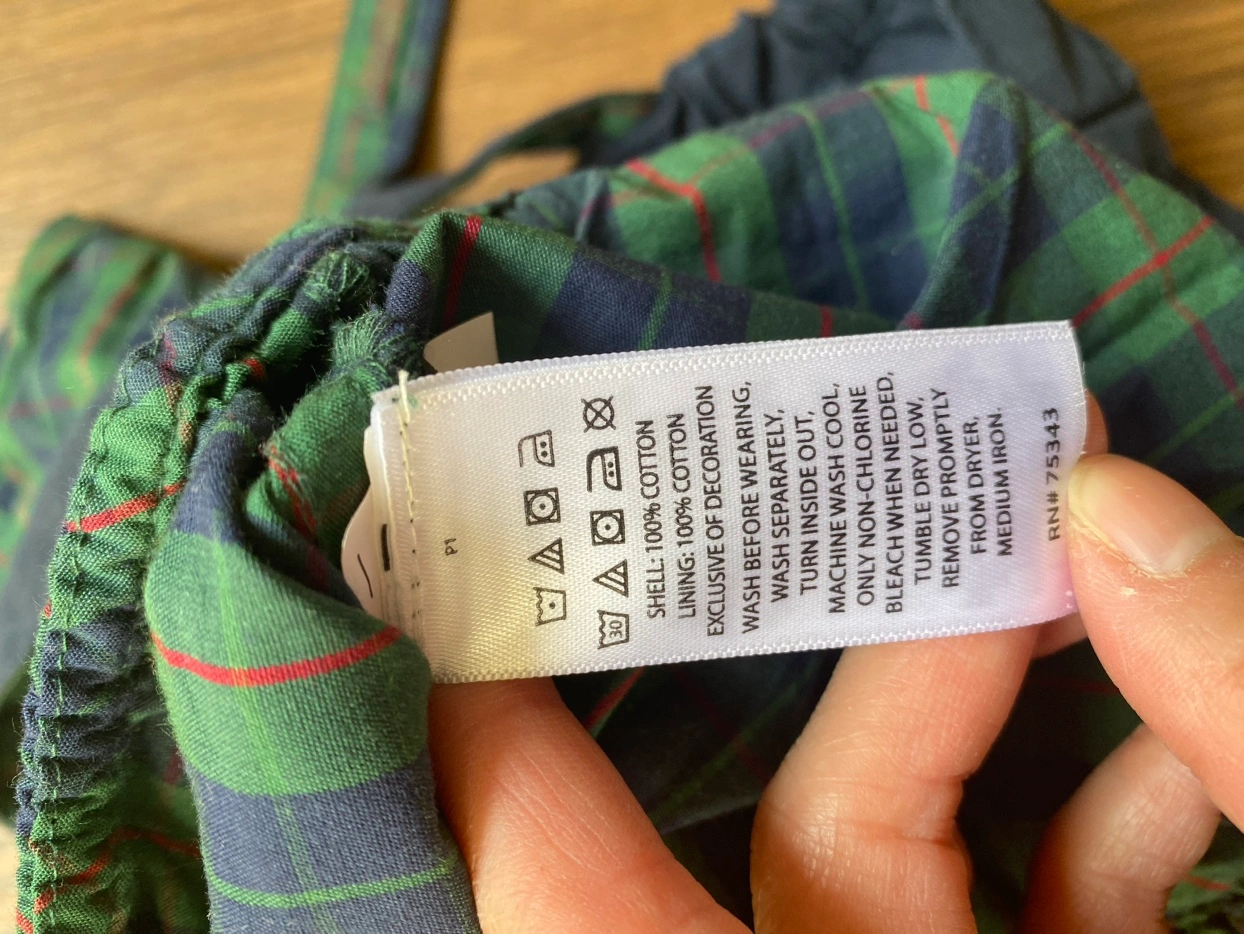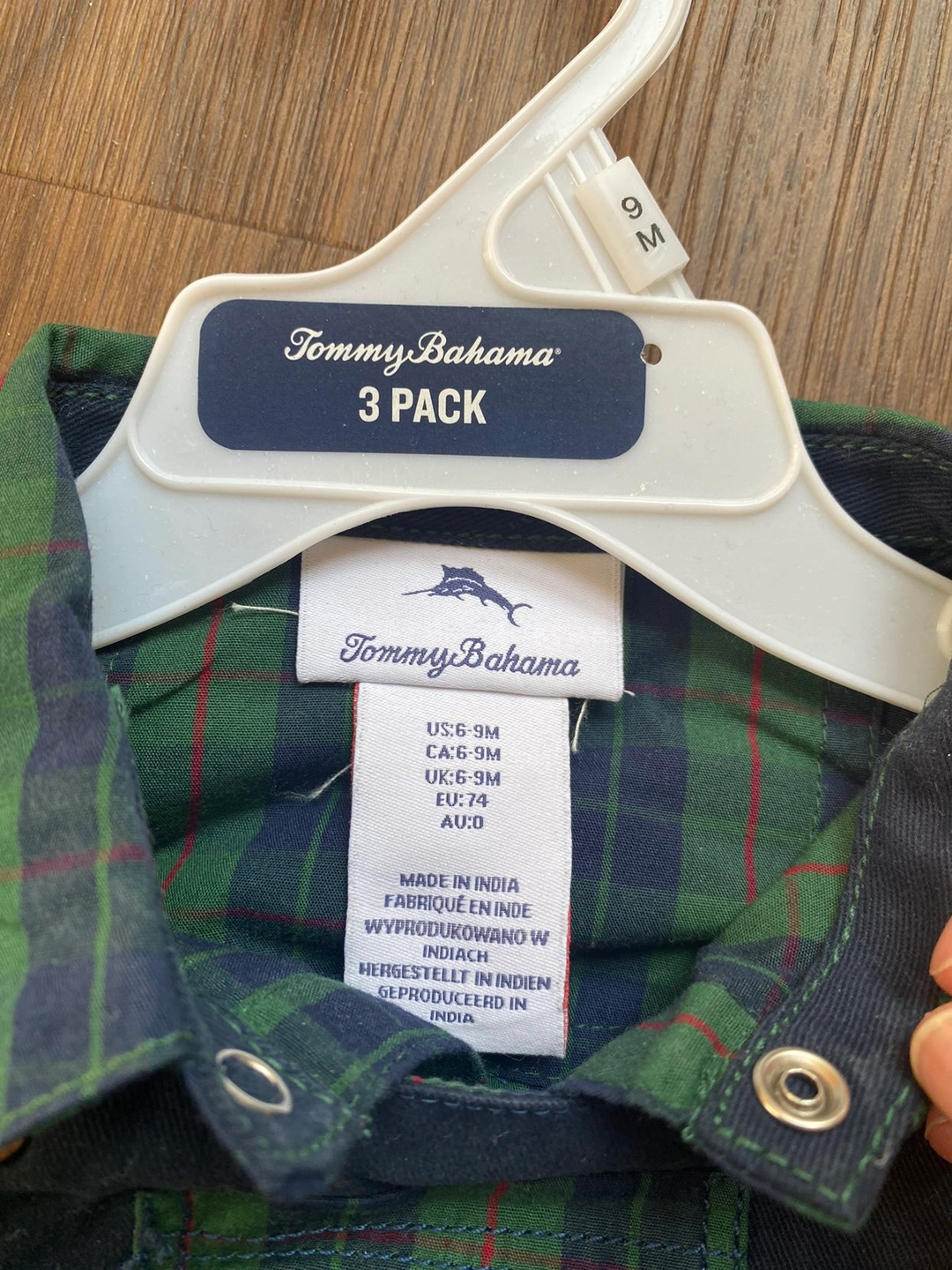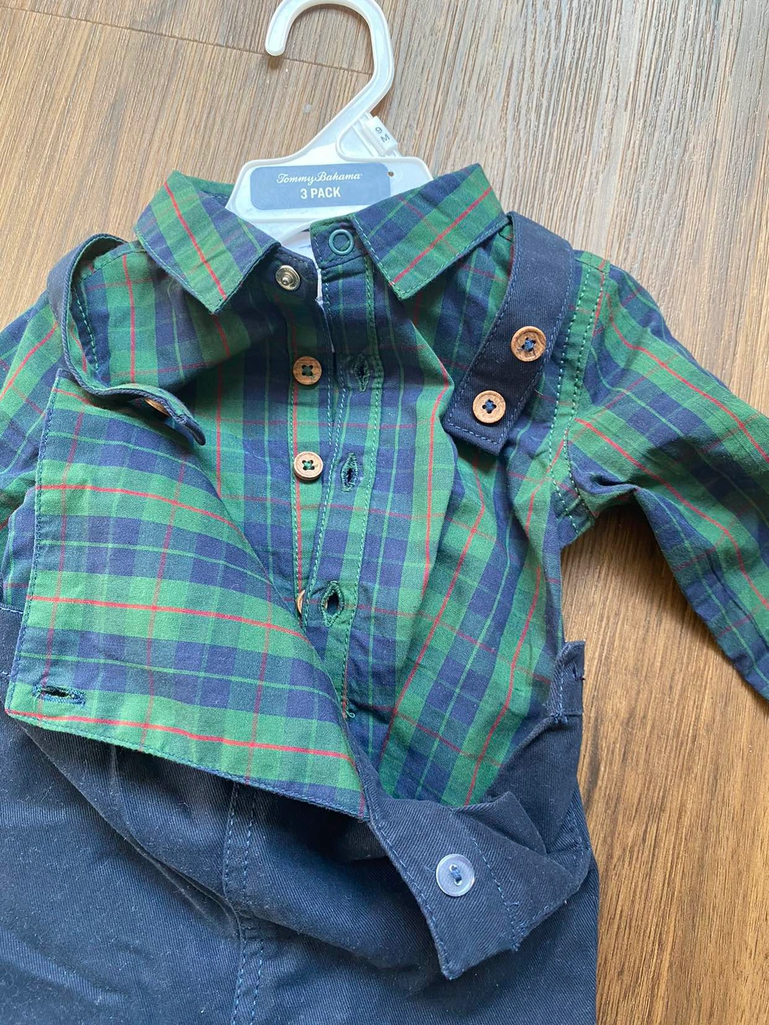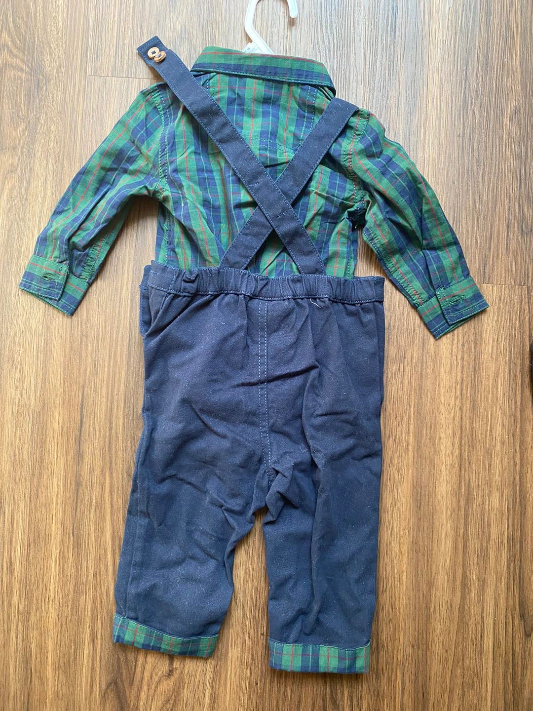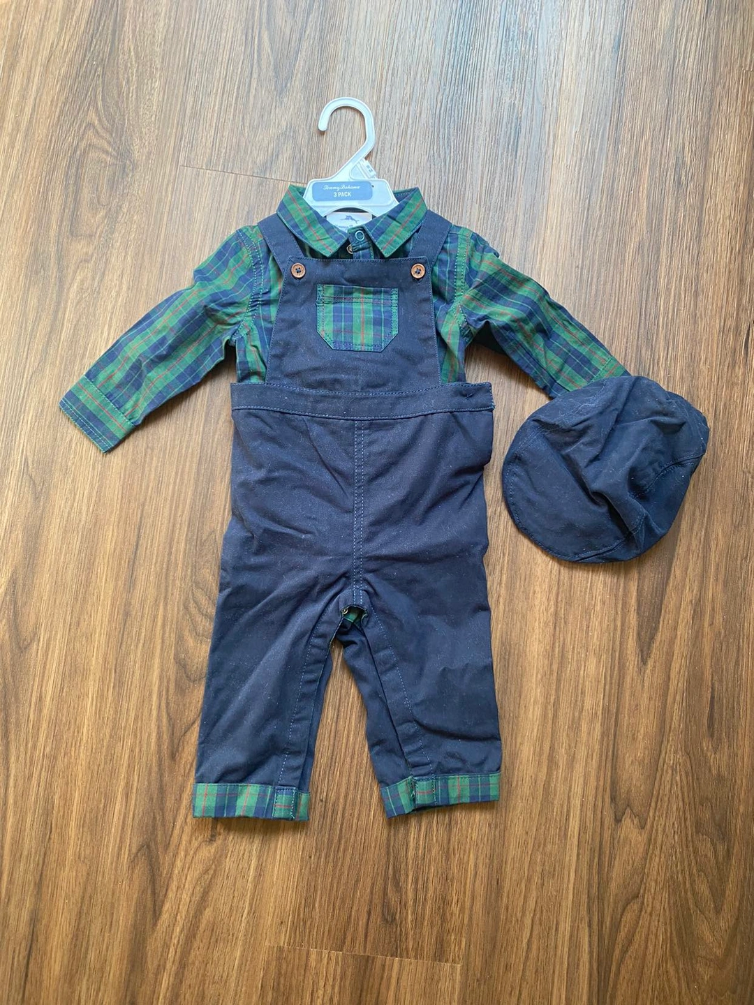 Navy overalls with matching tartan front pocket and snaps for easier diaper changes