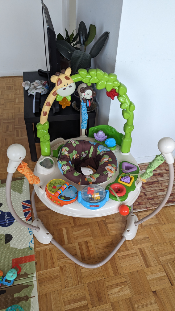 156used and in very good condition selling because baby has outgrown he enjoyed being in his jumperoo a lot plays music and lessons with batteries