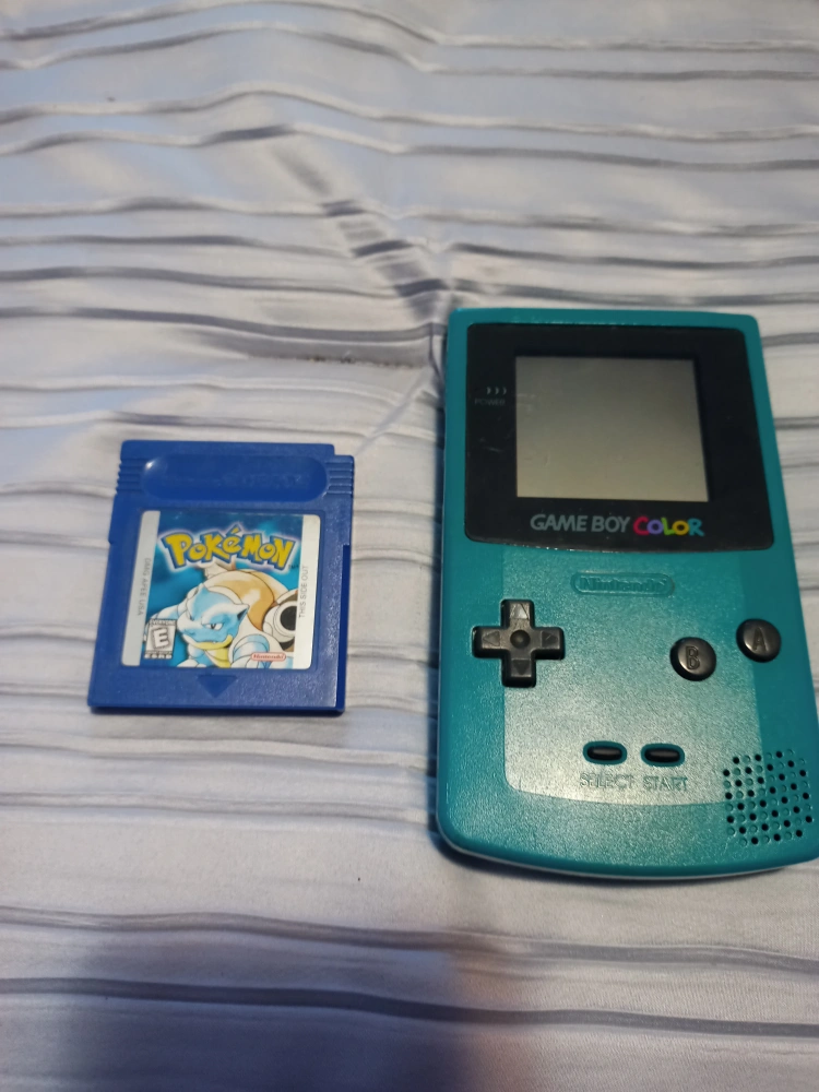 gameboy color teal usually goes for more but due to some of the wear on it i have listed it as less. the back cover falls off but it works fine without it.