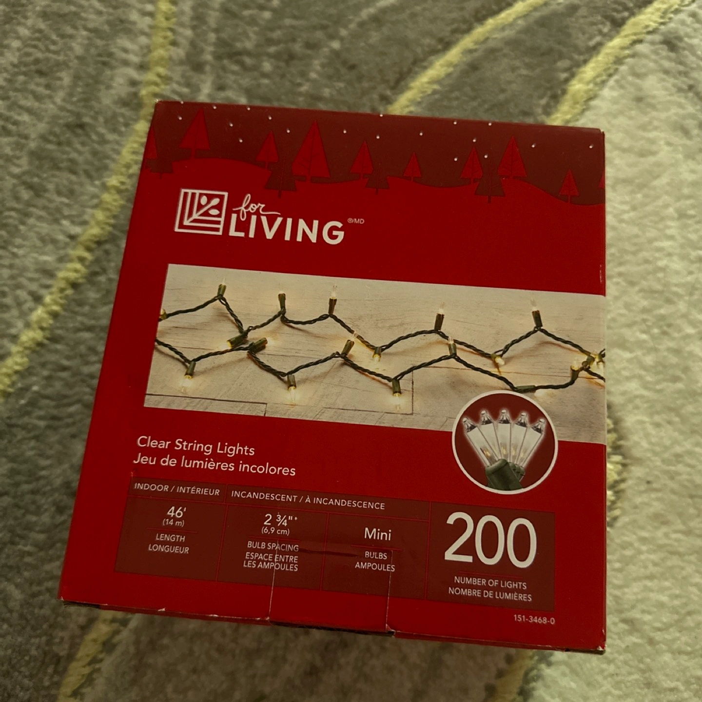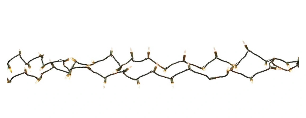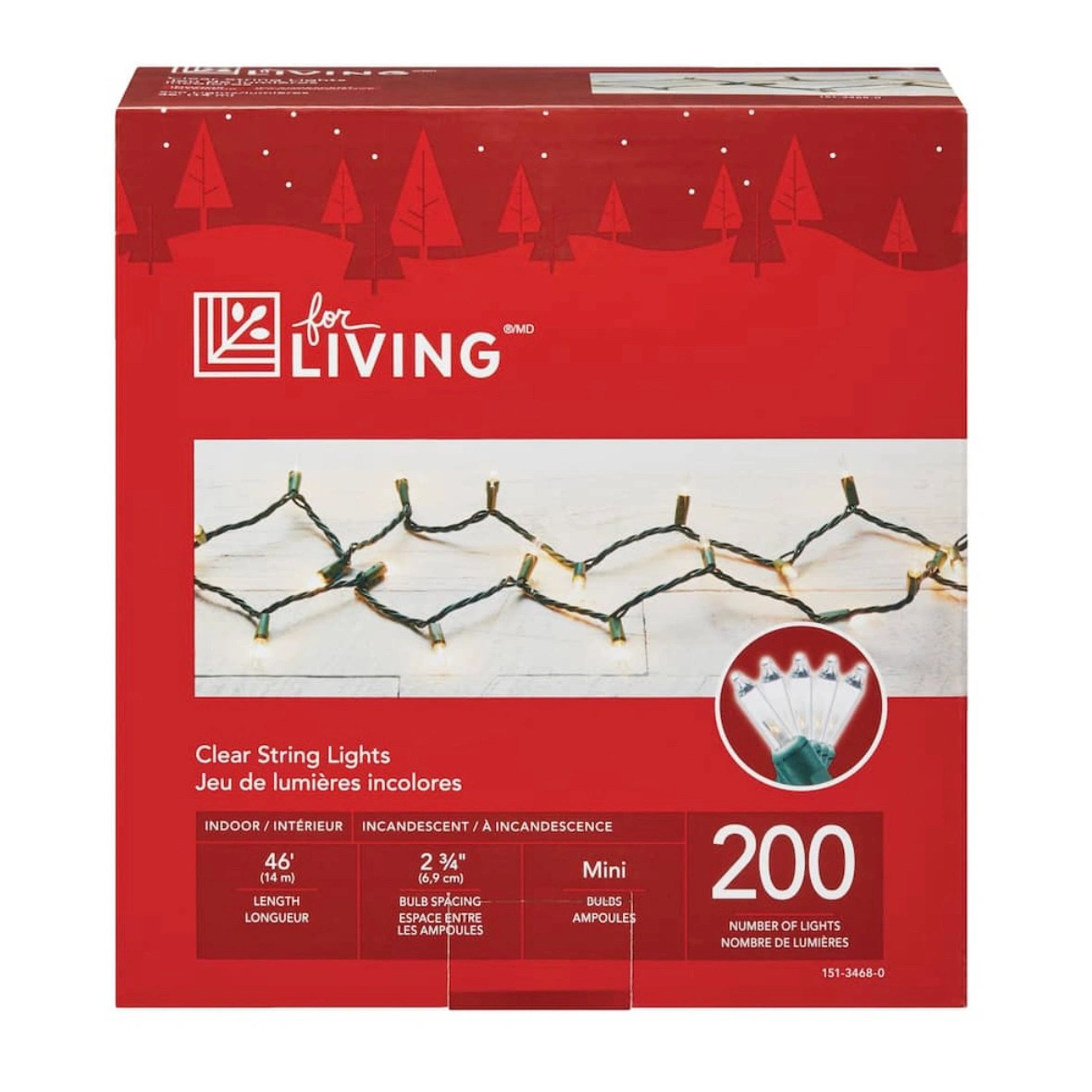 The For Living Indoor 200 Mini Incandescent Lights create an elegant glow among your indoor decorations. • Suitable for indoor use • End to end connectivity • Volt: 120 V • Includes 8 replacement bulbs • Colour: Clear Specifications • Assembled Length (cm): 1422.40 cm • Assembled Length (ft): 46.67 ft • Assembled Length (in): 560 in • Cord Colour: Green •Light Bulb Colour(s): Clear • Light Bulb Type: Incandescent