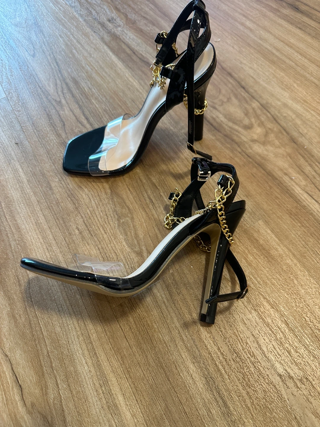 These stylish black heels feature a clear strap and a chic gold chain detail. They're perfect for dressing up any outfit! They appear to be in great condition and ready for a new home.