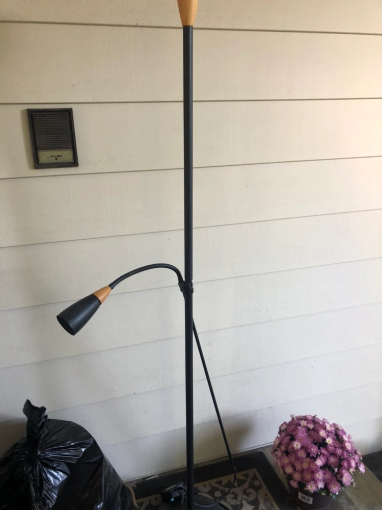 Black floor lamp with a flexible arm and a wooden accent. The lamp is in good condition. It comes with a power cord and a switch. I am unable to provide the lightbulb.