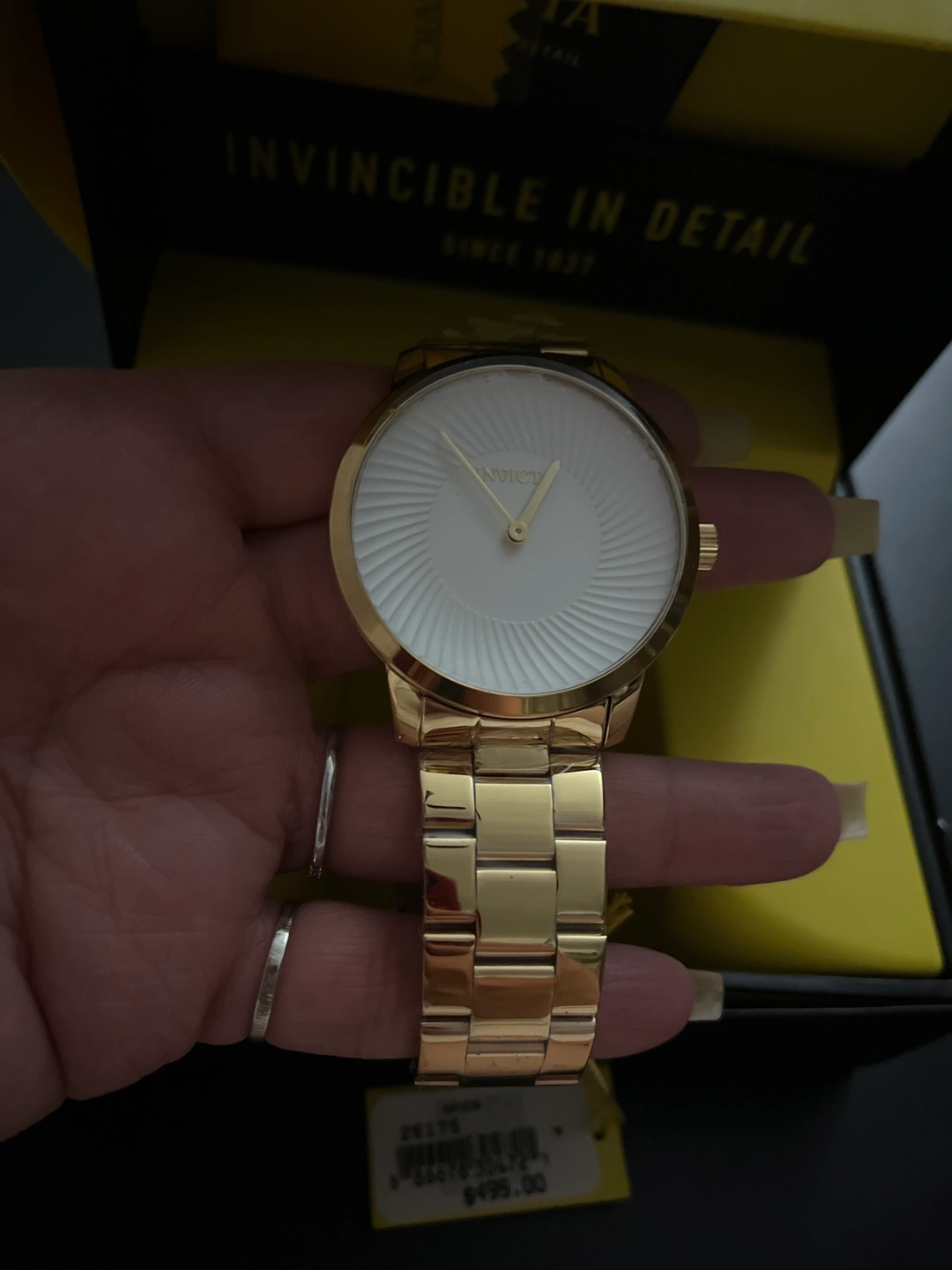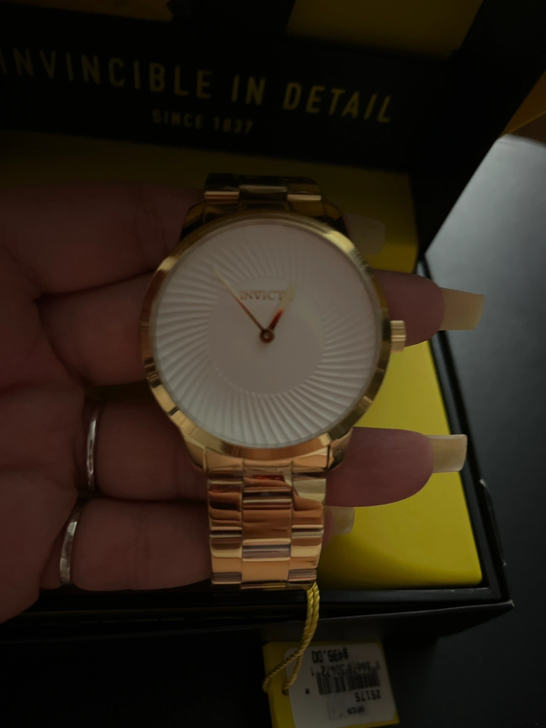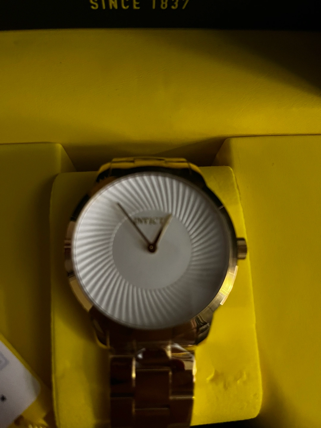 It is gold toned. The dial is purely white with no numbers at all. It looks fabulous. All the plastics are on there and as you could see the tigers there also.
