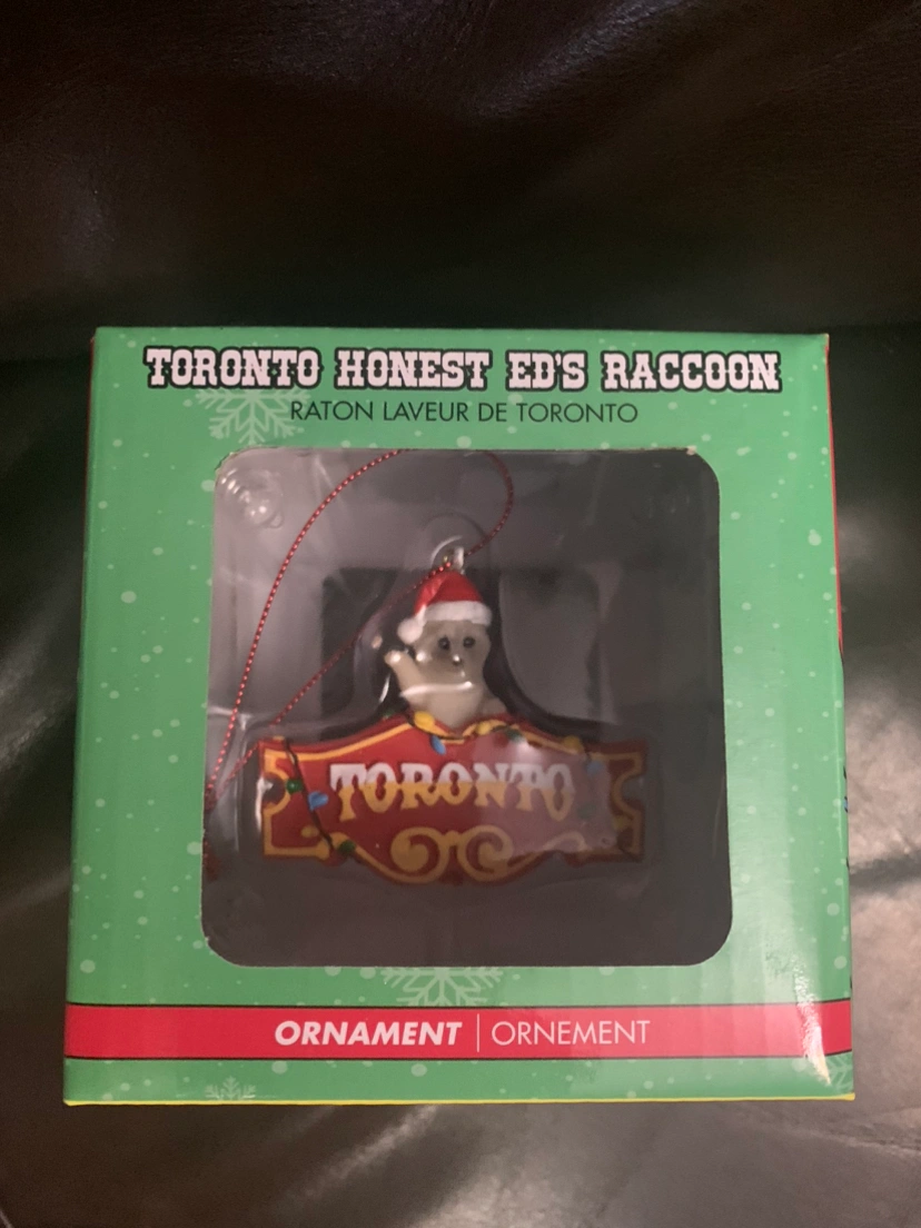 New in box. Highly collectible, sold out Honest Ed’s Raccoon Christmas ornament.