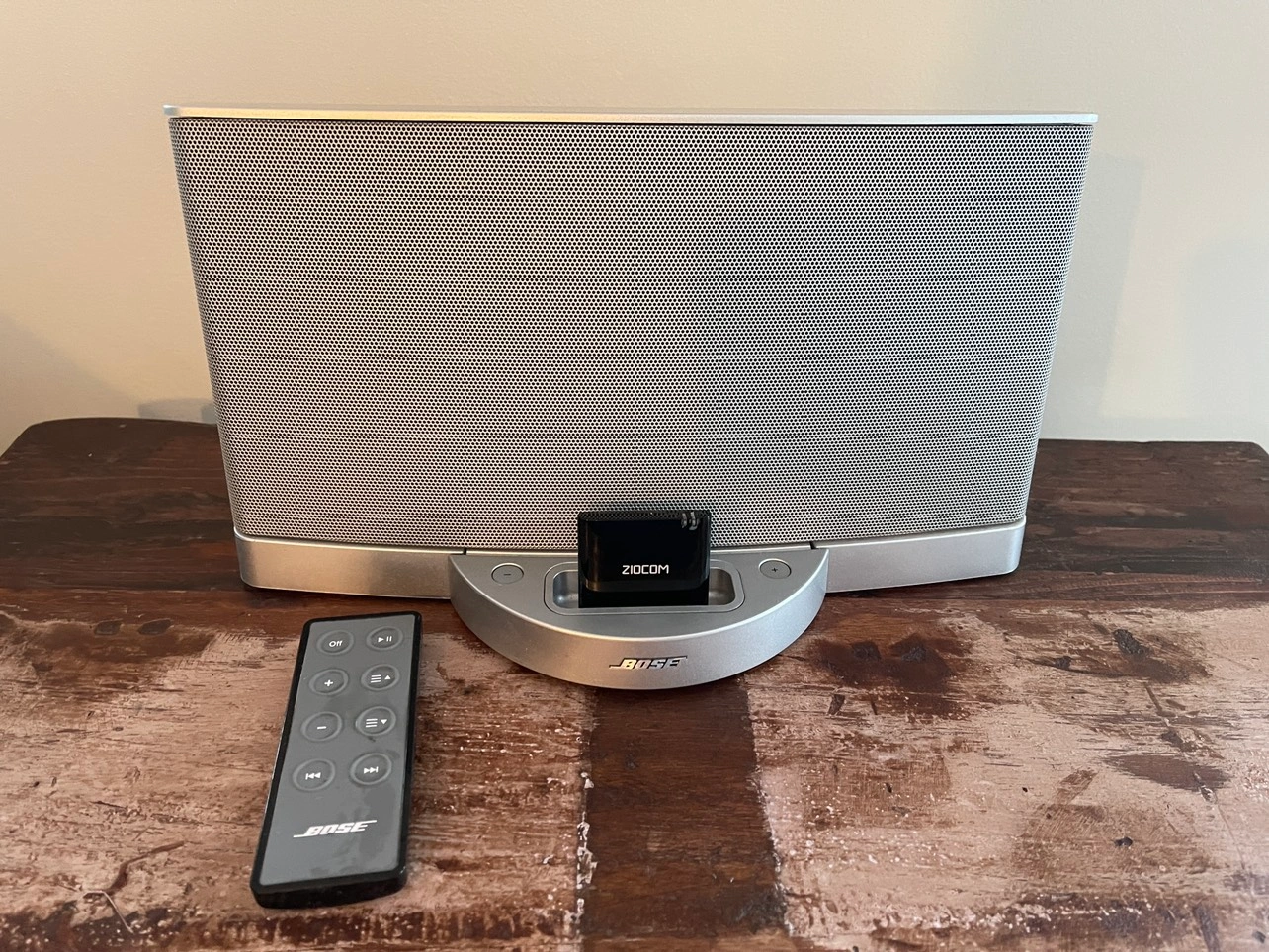 I bought a new sound bar so no longer need my BOSE Sound Dock. It’s in MINT condition. Sounds fantastic and comes with the original remote and a added Bluetooth compatible component so you can stream your music from your phone. If the ads up it’s available.
