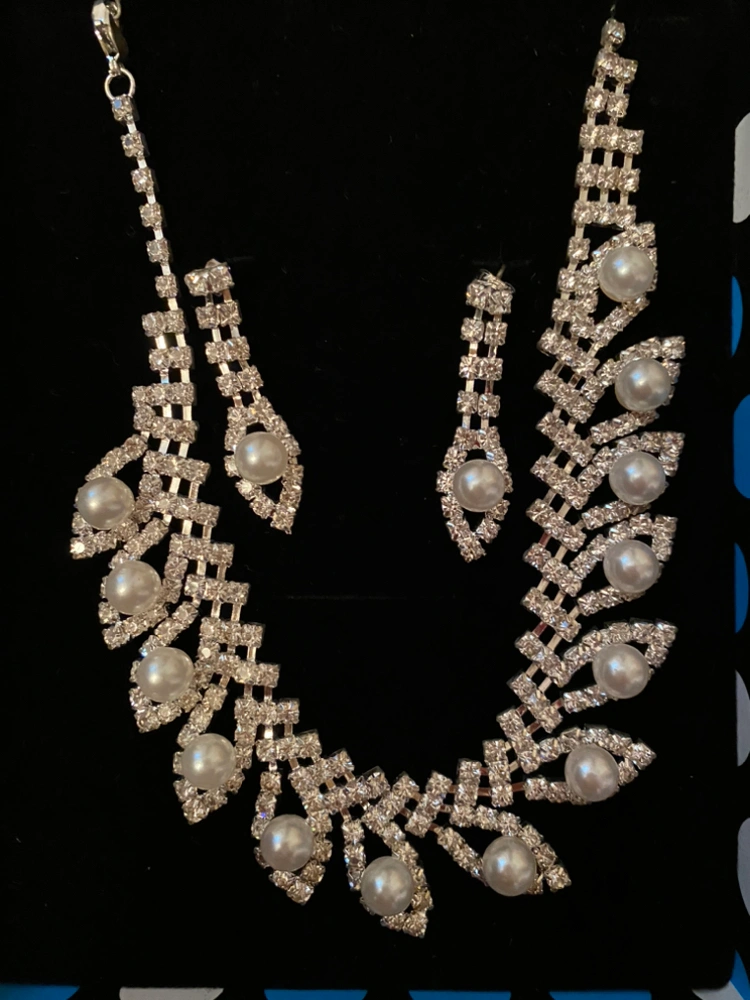 Very elegant pearl and clear stone necklace and matching earrings set. Comes in a box for gifting. Never used. High end quality costume jewelry. Beautiful for holiday parties