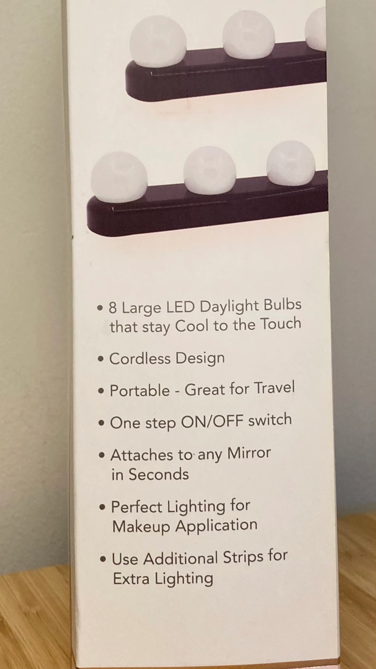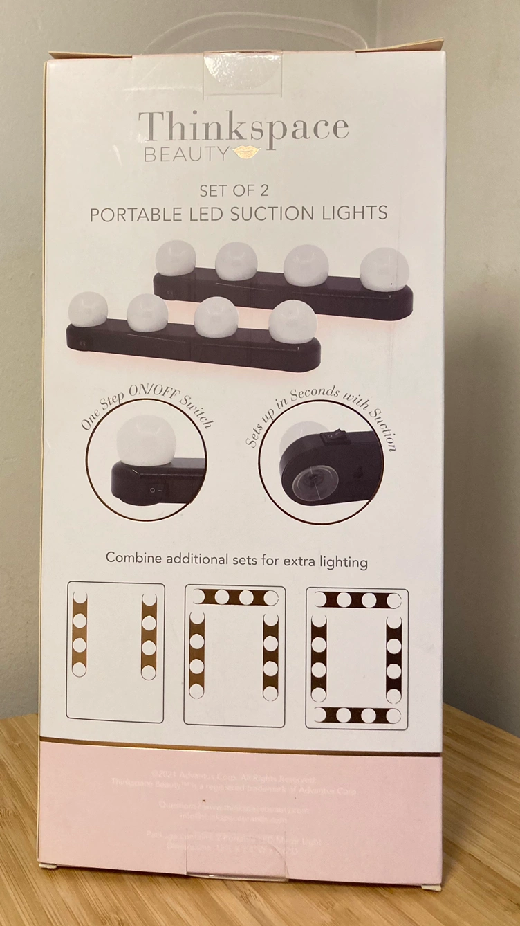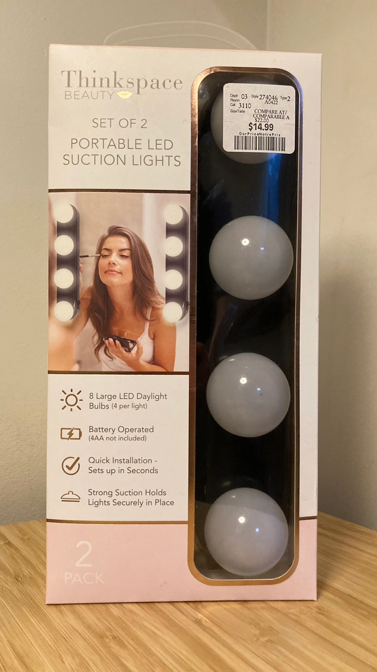 BNIB 2-pack! Soft white glow. Efficient. Stays put on a mirror surface with suction cups, or hung on a wall with screws.