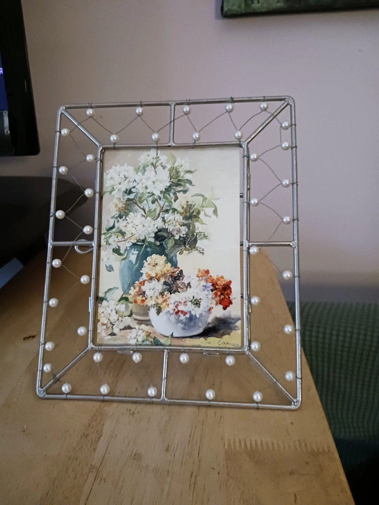 Uniquely beautiful see through photograph frame made of silver metal edging, wire and pearls. Would be perfect for a beautiful photo of a loved one!