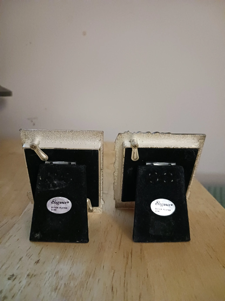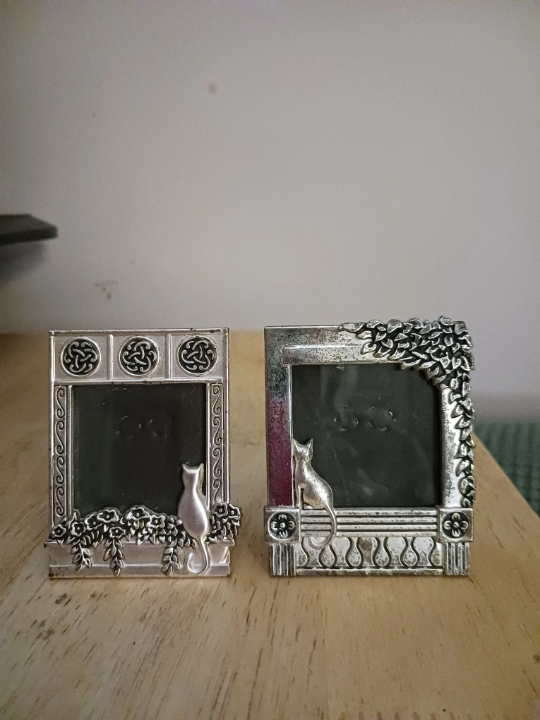 These are really cute silver on zinc frames with cat motifs. The slightly narrower frame is in very good condition while the finish on the other one seems worn, so I include it free, and it isn't very noticeable at a little distance.