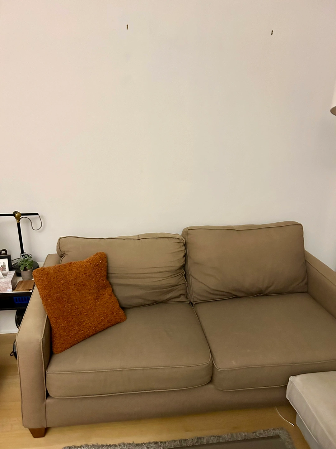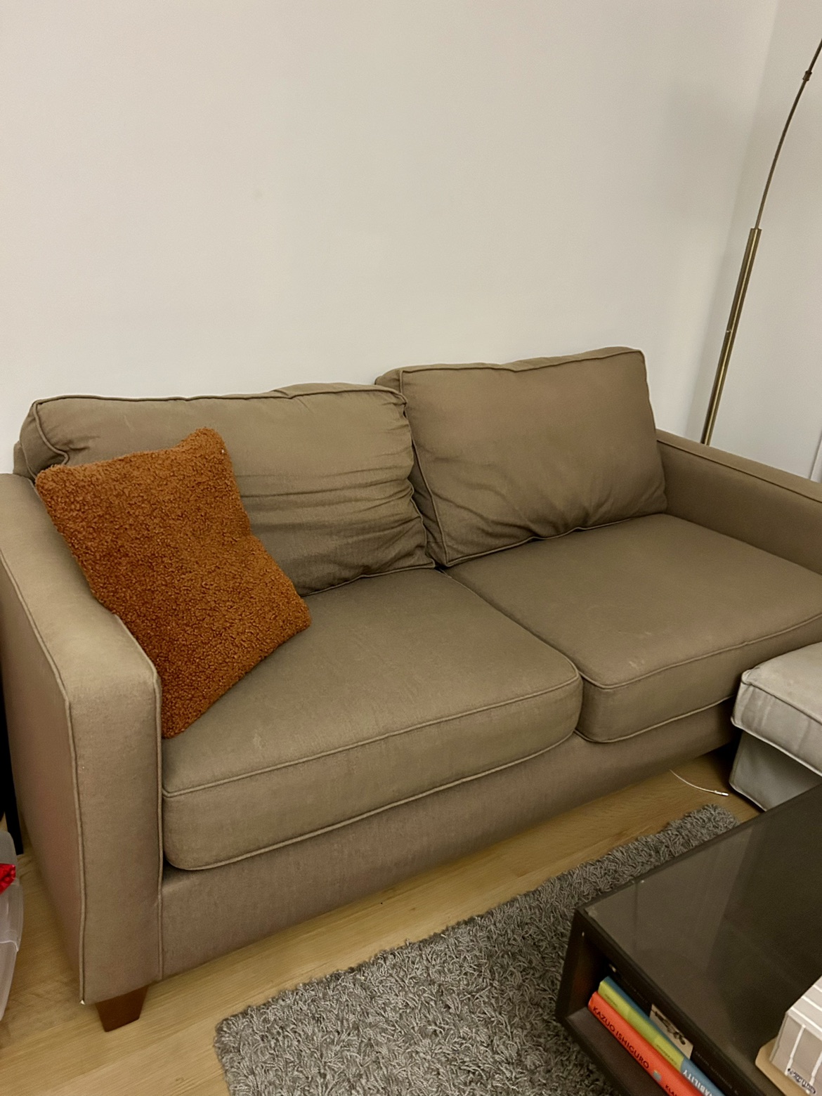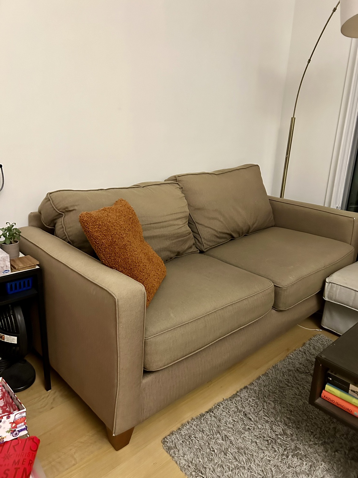 Comfy brown fabric couch with wood legs. Some wear and tear. Pickup only. 76 width 35 depth 29 height. Pillow not included