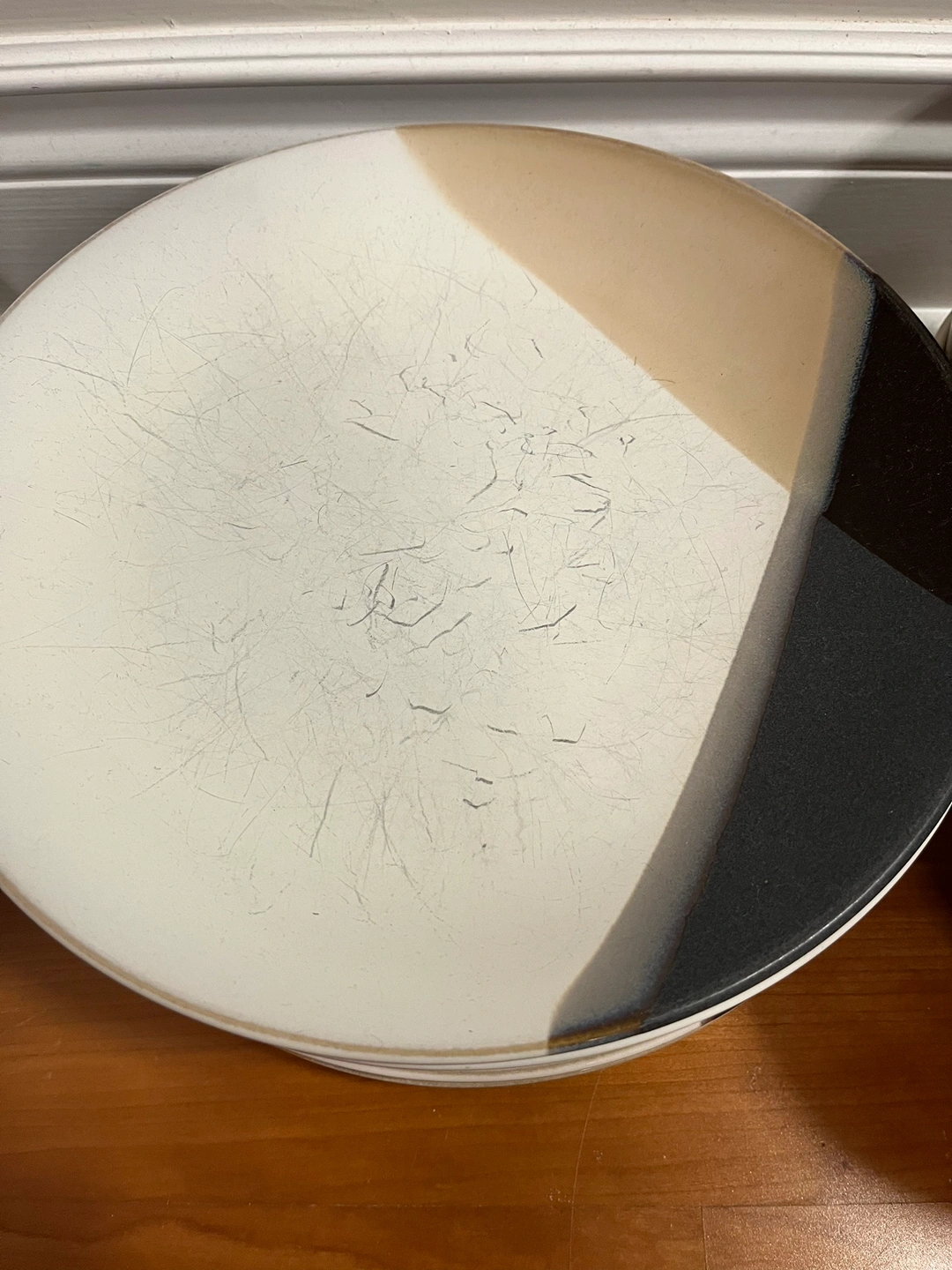 Some plates and bowls have cutlery scratches (as seen in photo 2) but Barkeepers Friend can buff them out.
