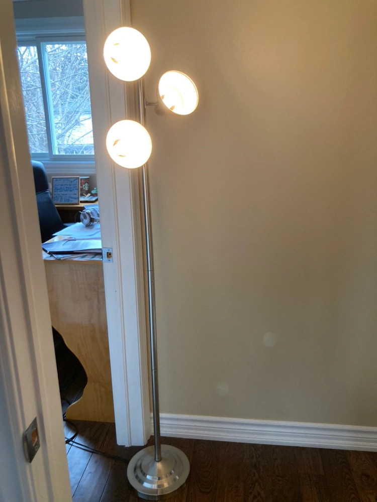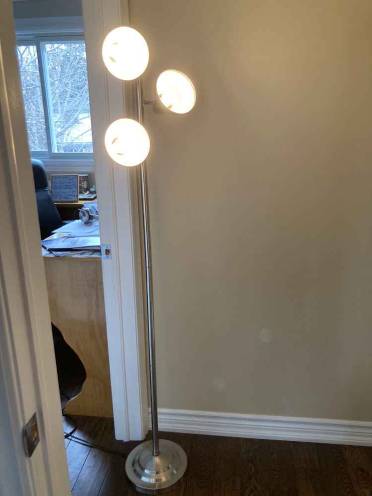 This lamp does not have the weight on the base but all other aspects of it work. Three lightbulbs included. As the lamp does not stand up on its own (weight has been removed) one would need place it In a corner, or in a door frame as pictured. The three lamps are pivotal/rotational so you can target the area you would like to brighten.