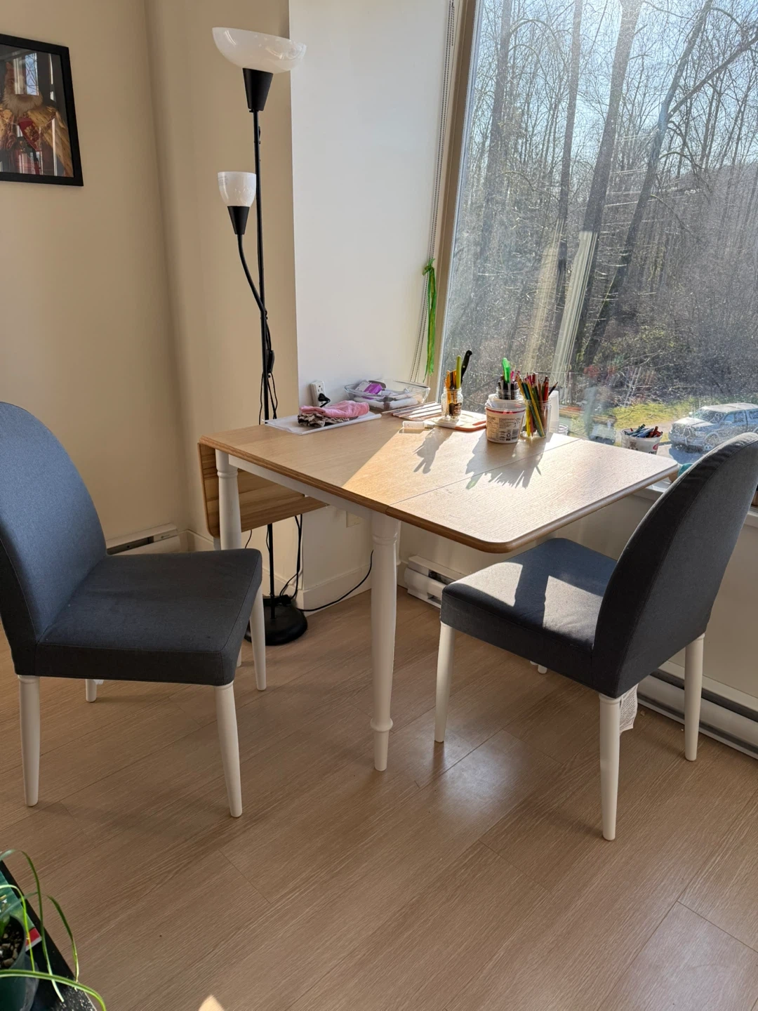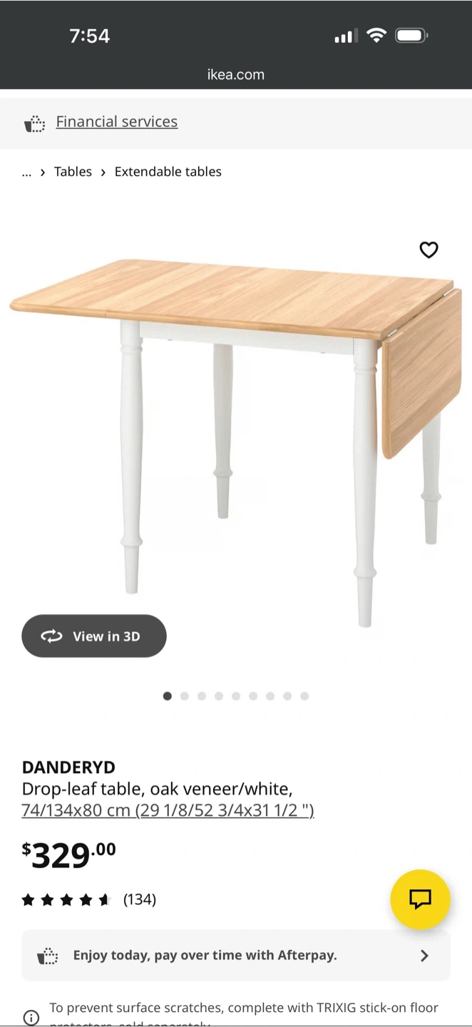 This is the IKEA DANDERYD drop-leaf table, finished in oak veneer and white. It's a versatile table that can extend from 74 cm up to 134 cm in length, with a width of 80 cm and a height of 75 cm. Perfect for smaller spaces that need occasional extra room!