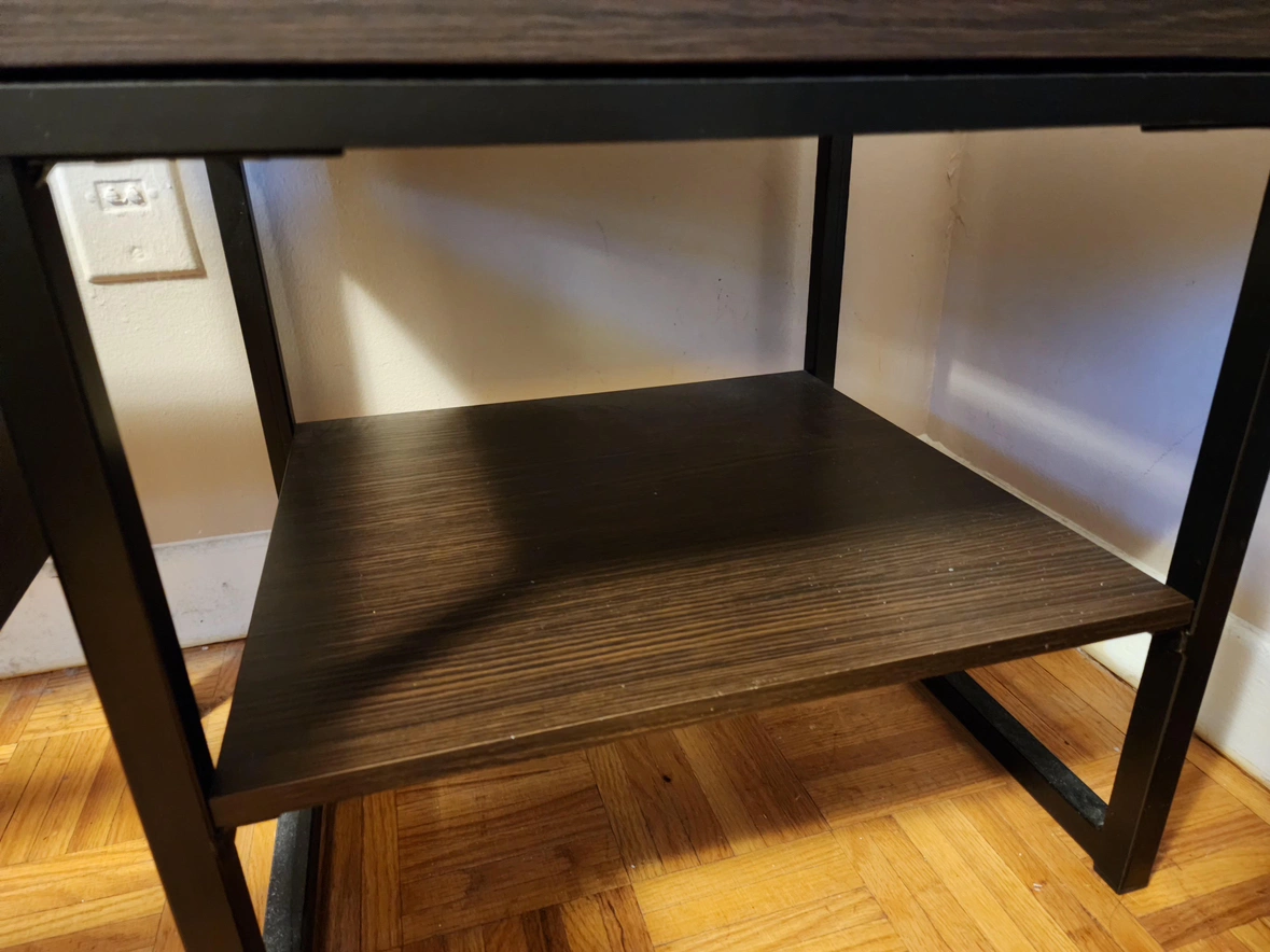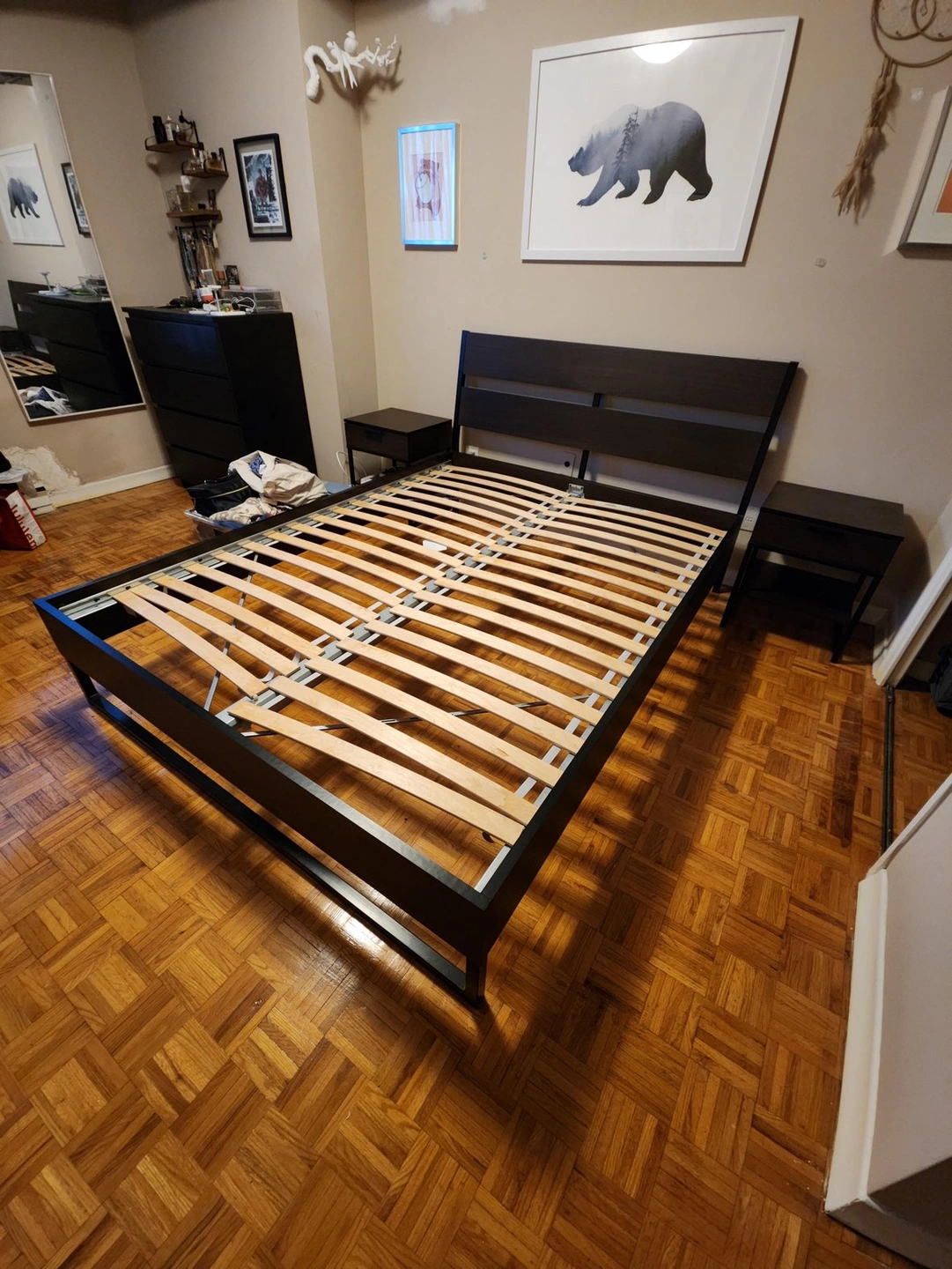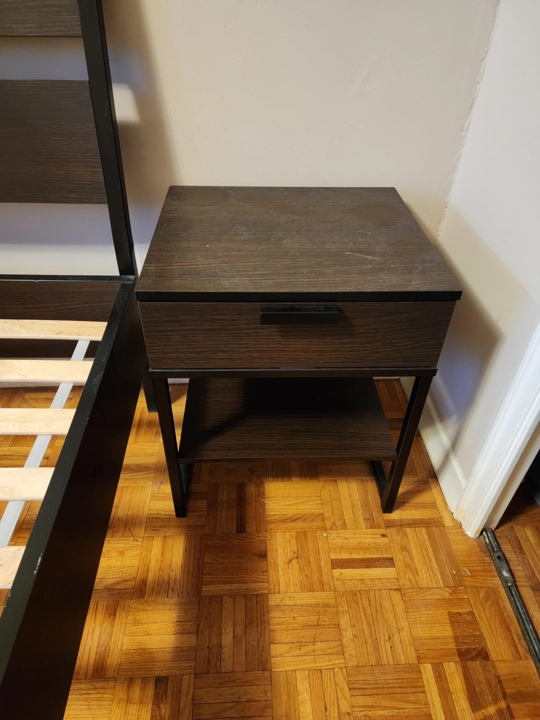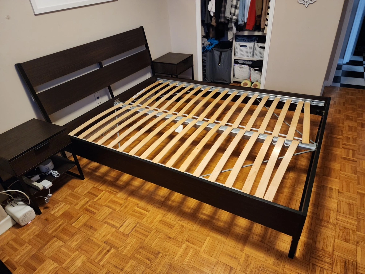 Bed frame has been disassembled for pickup. Tables are still intact.
