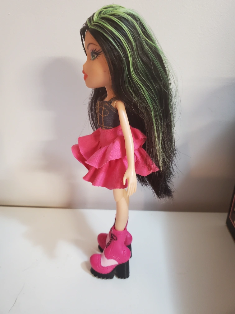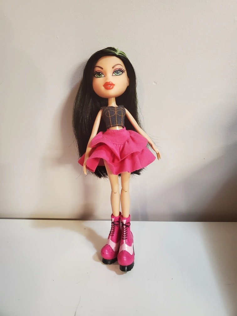 Jade is dressed in a trendy outfit that includes a denim vest, pink tank top, and black leggings with studded accents. Her shoes are black ankle boots with silver buckles. This original Bratz doll is retired and no longer produced, making it a rare find for enthusiasts. Add Jade to your collection or give her as a gift for any occasion.