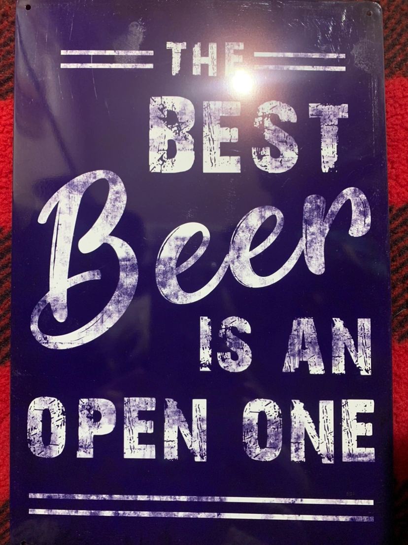 Brand New tin sign “the BEST Beer is an Open One” (white letters on blue background)-8 in. Wide by 12” long -possible meet up, subway