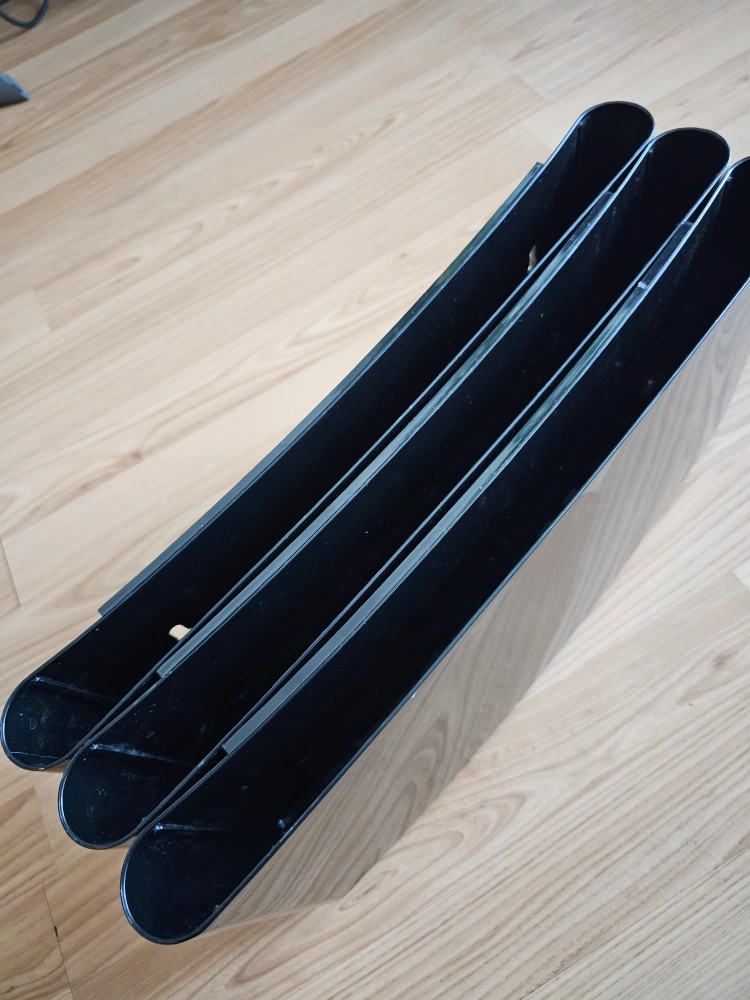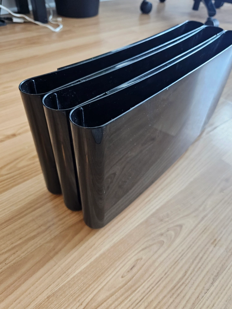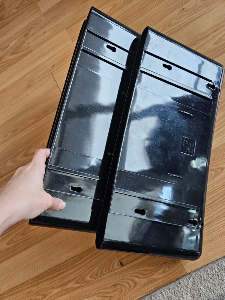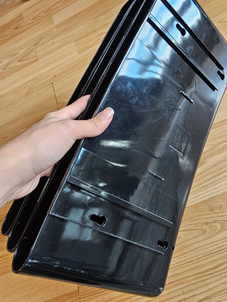 big and sturdy. has notches to be mounted on a wall. three compartments, all three can be hung up/reordered.