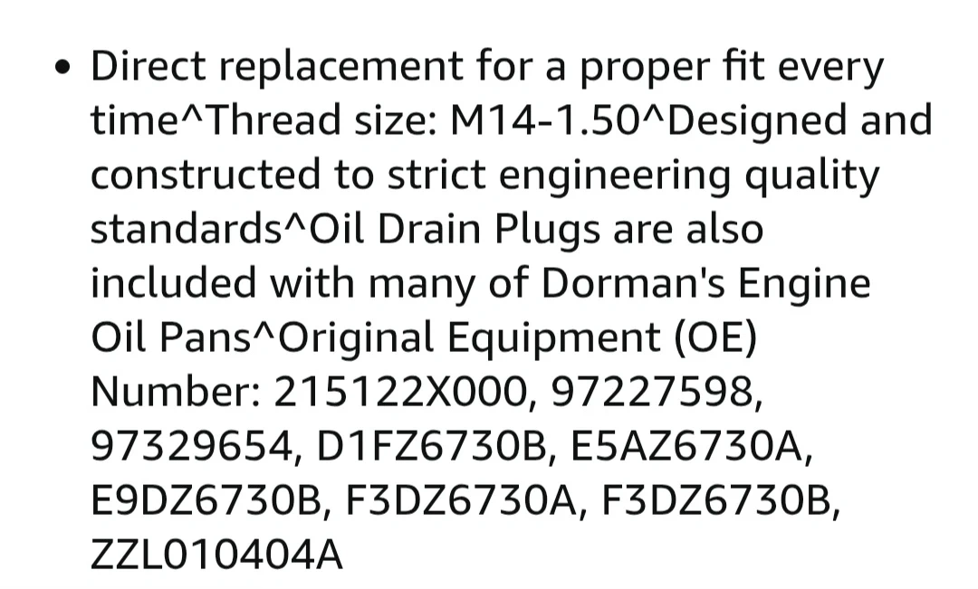 This Dorman oil drain plug features M14-1.50 thread size for a proper fit. It's designed and constructed to strict engineering quality standards. The plug is made of metal and includes a blue washer.